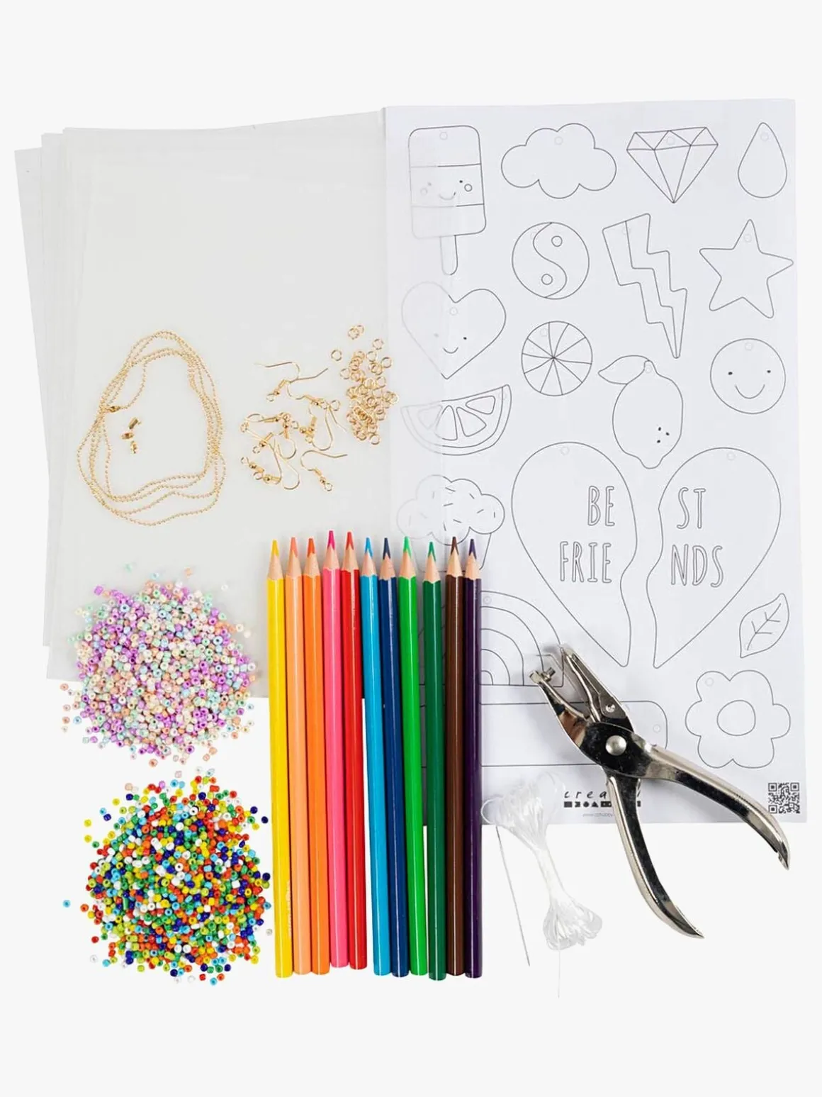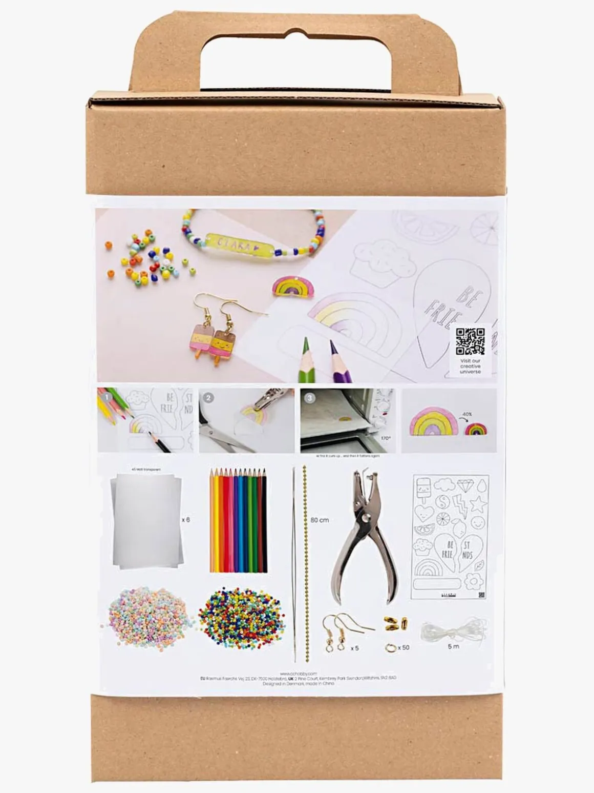 – Indeholder: Krympeplastfolie, farveblyanter, perler, ørekroge, kæder og hulstempler.