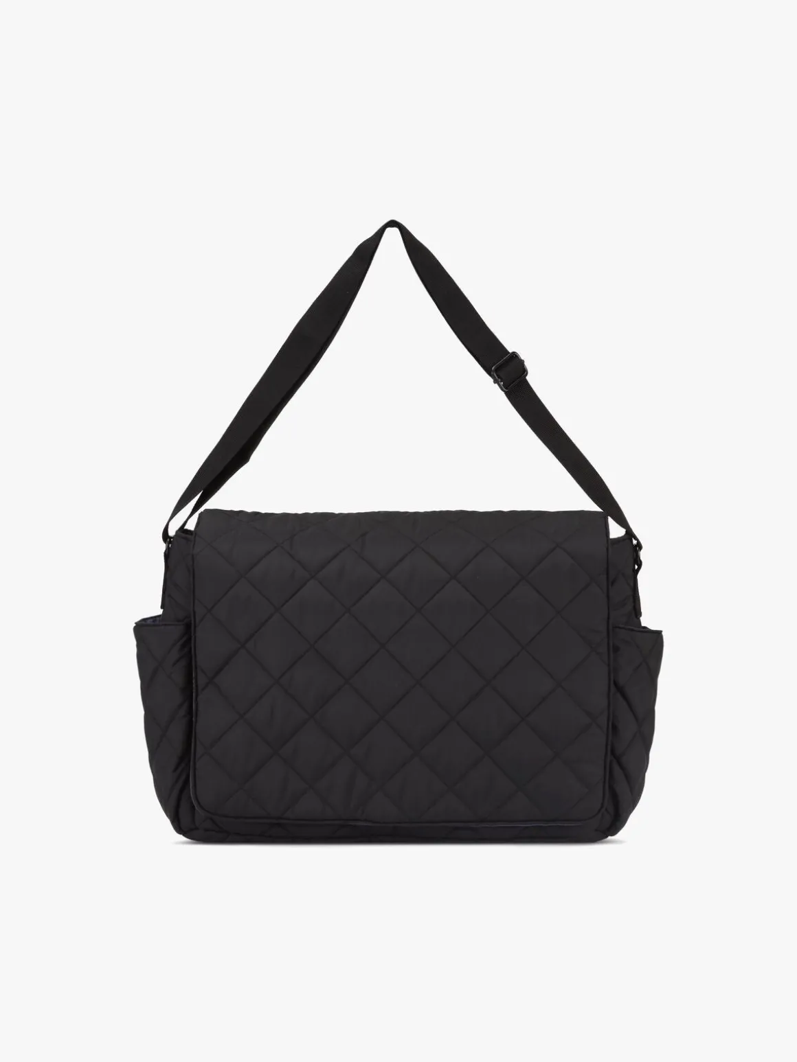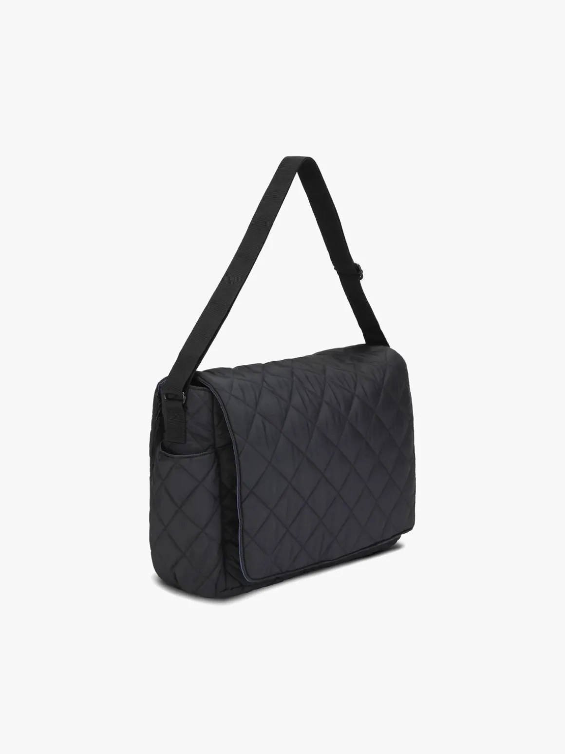 Tasken har en justerbar skulderstrop, der er let at svinge over skulderen eller vognens styr.