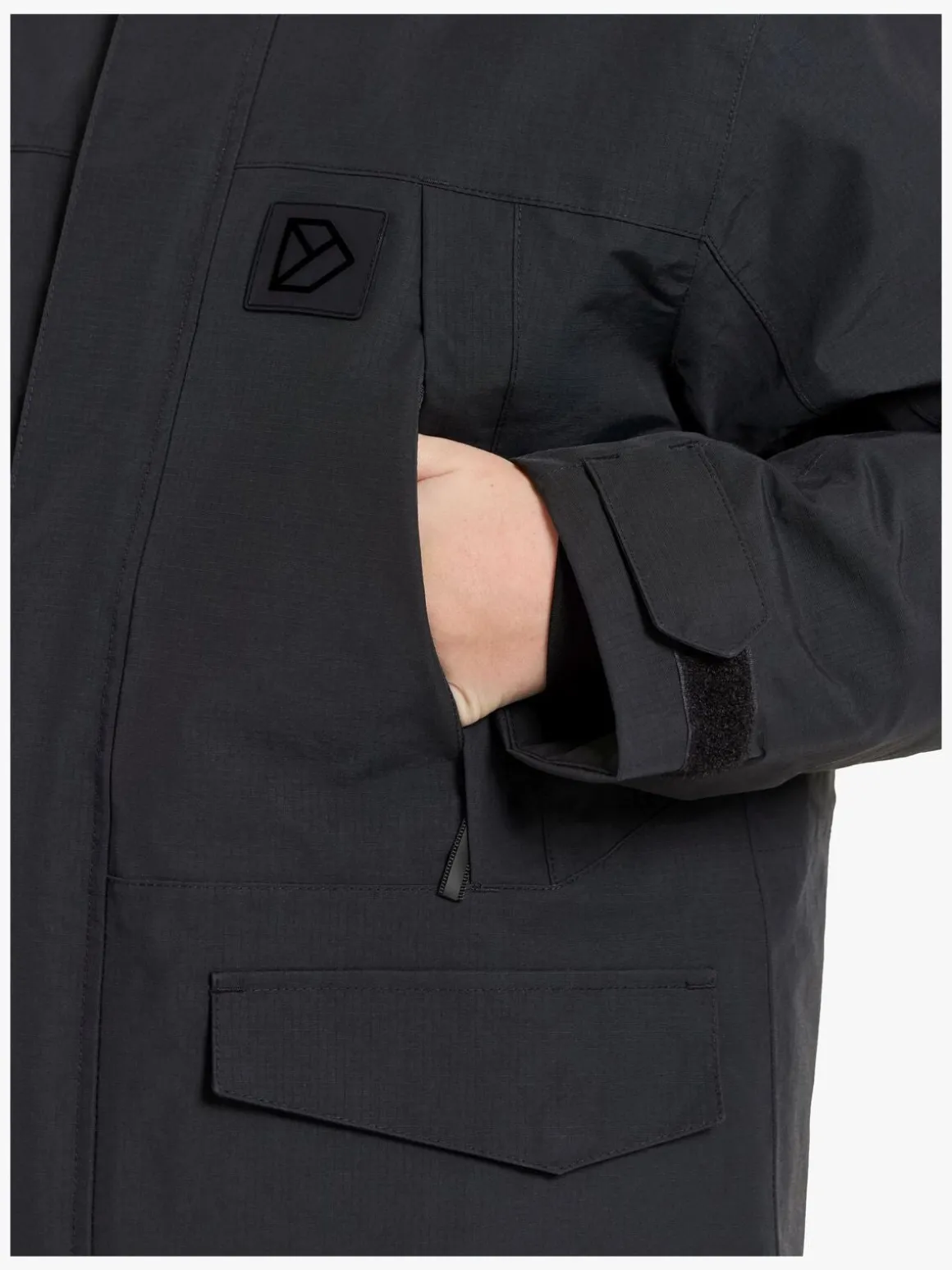 – Elastiske ærmeender med hul til tommelfinger.