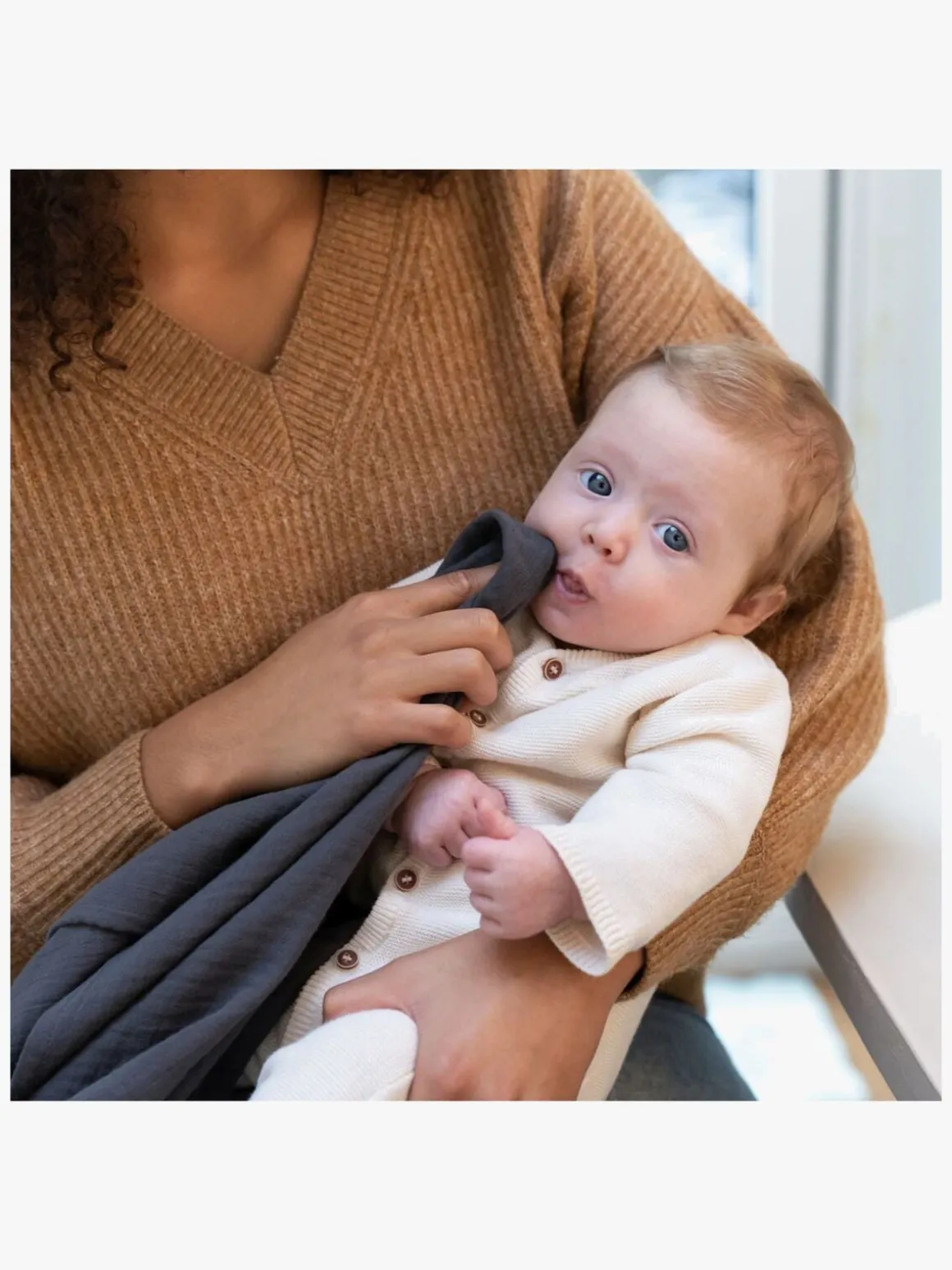 – En praktisk silikonering gør det nemt at fastgøre amme-/nussekluden om halsen på den voksne.