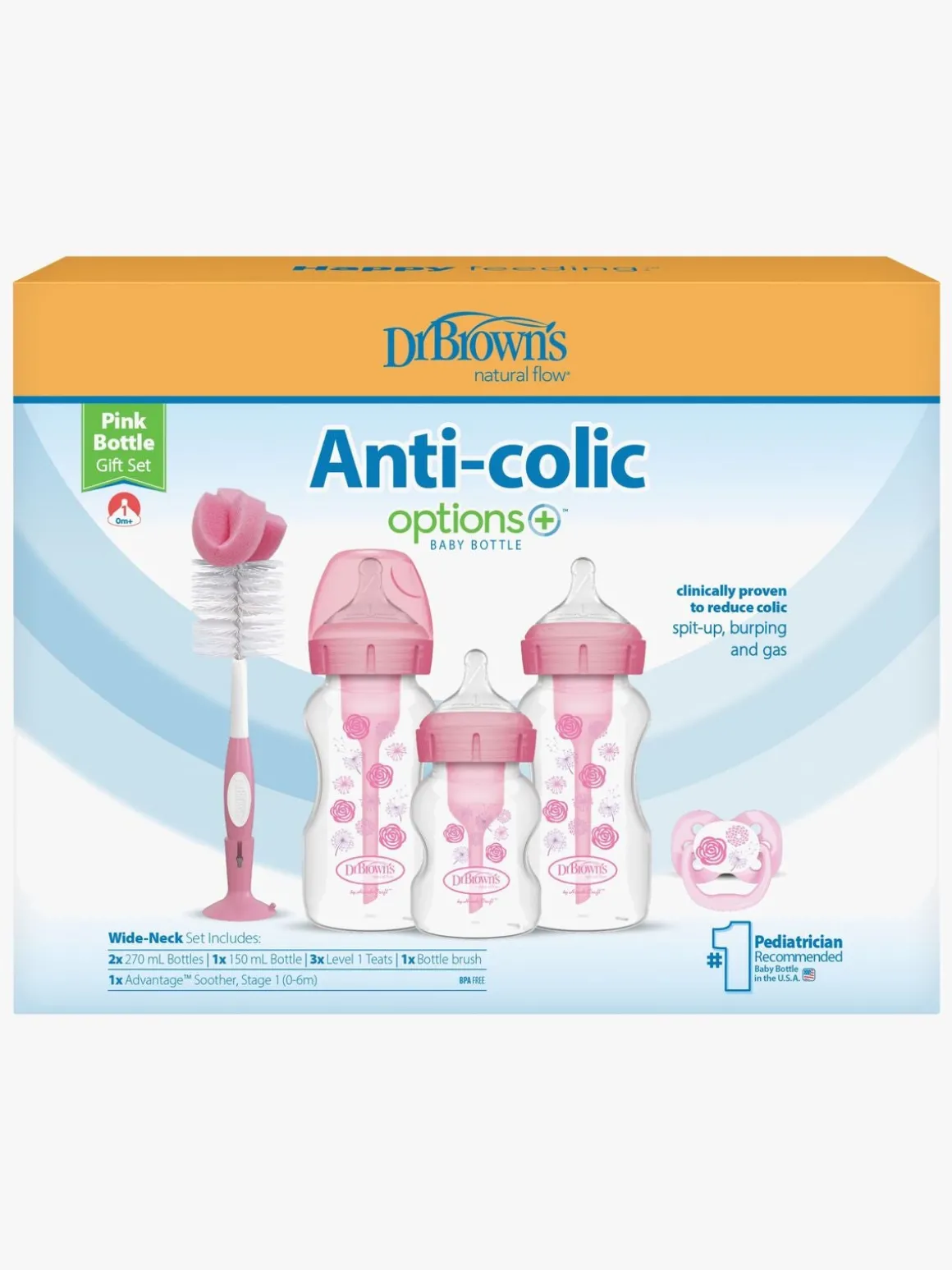 – Indeholder: 2 sutteflasker på 270 ml, 1 sutteflaske på 150 ml, 1 flaskebørste, 1 sut.