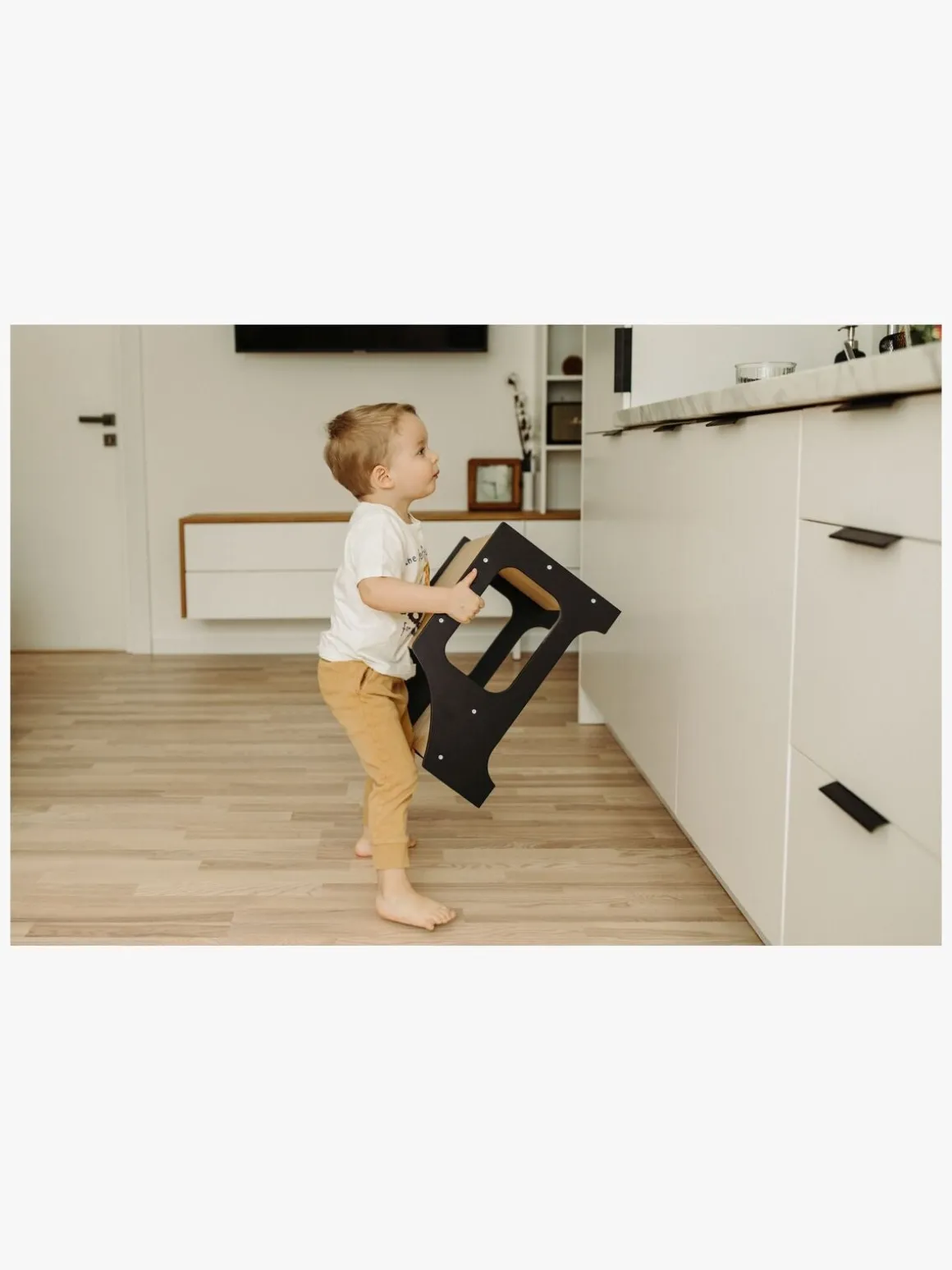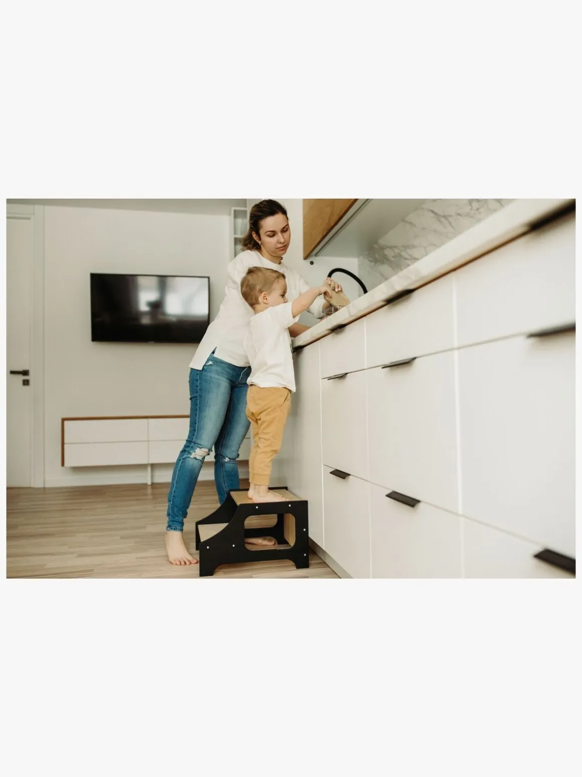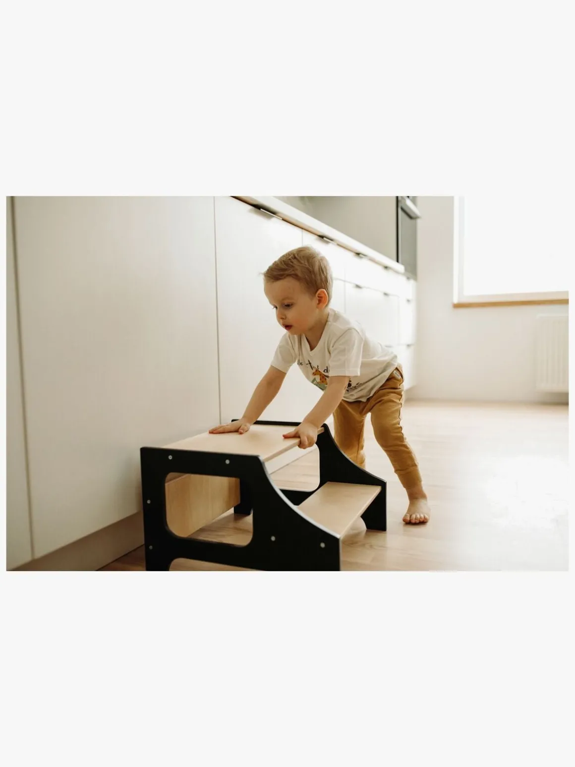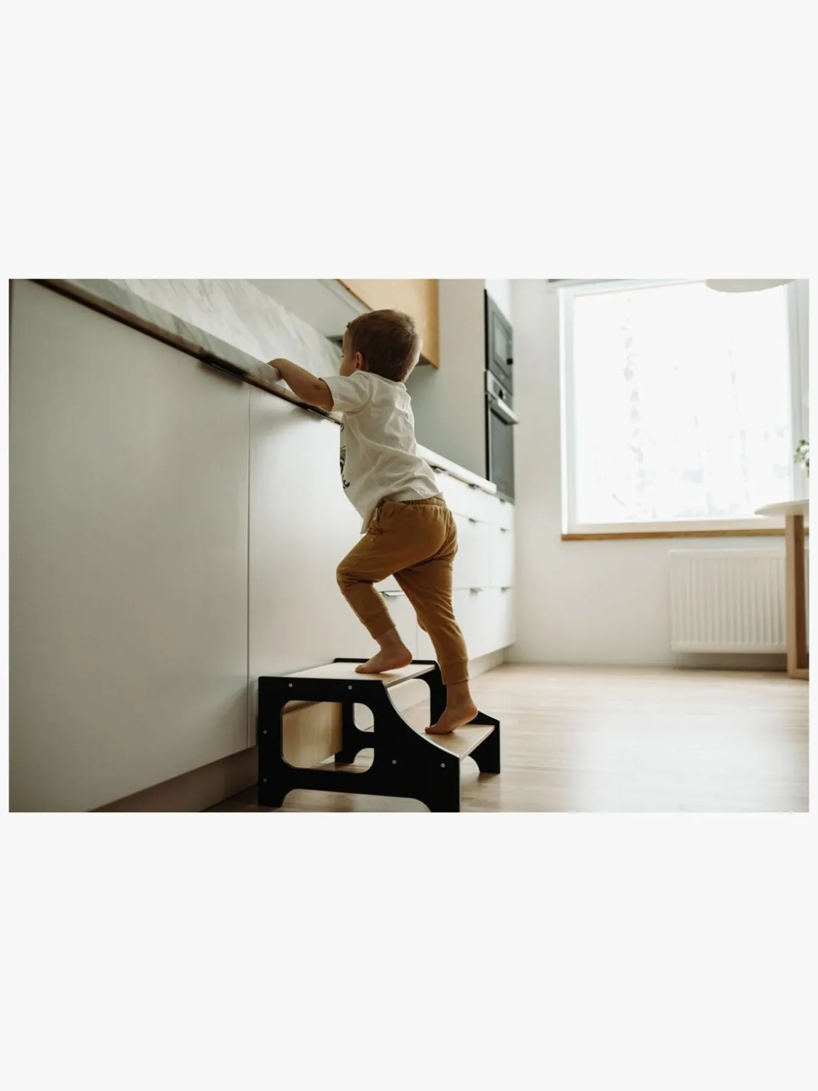 – Et læringstårn hjælper dit barn med at komme op på samme niveau som dig på en sikker måde. Perfekt, når du gerne vil have dit barn tæt på, så det kan lære og udforske aktiviterne i køkkenet.