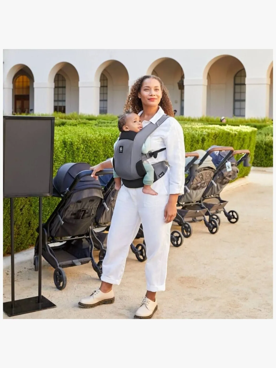 – Indbygget hætte til beskyttelse mod solen og til skjul ved amning.