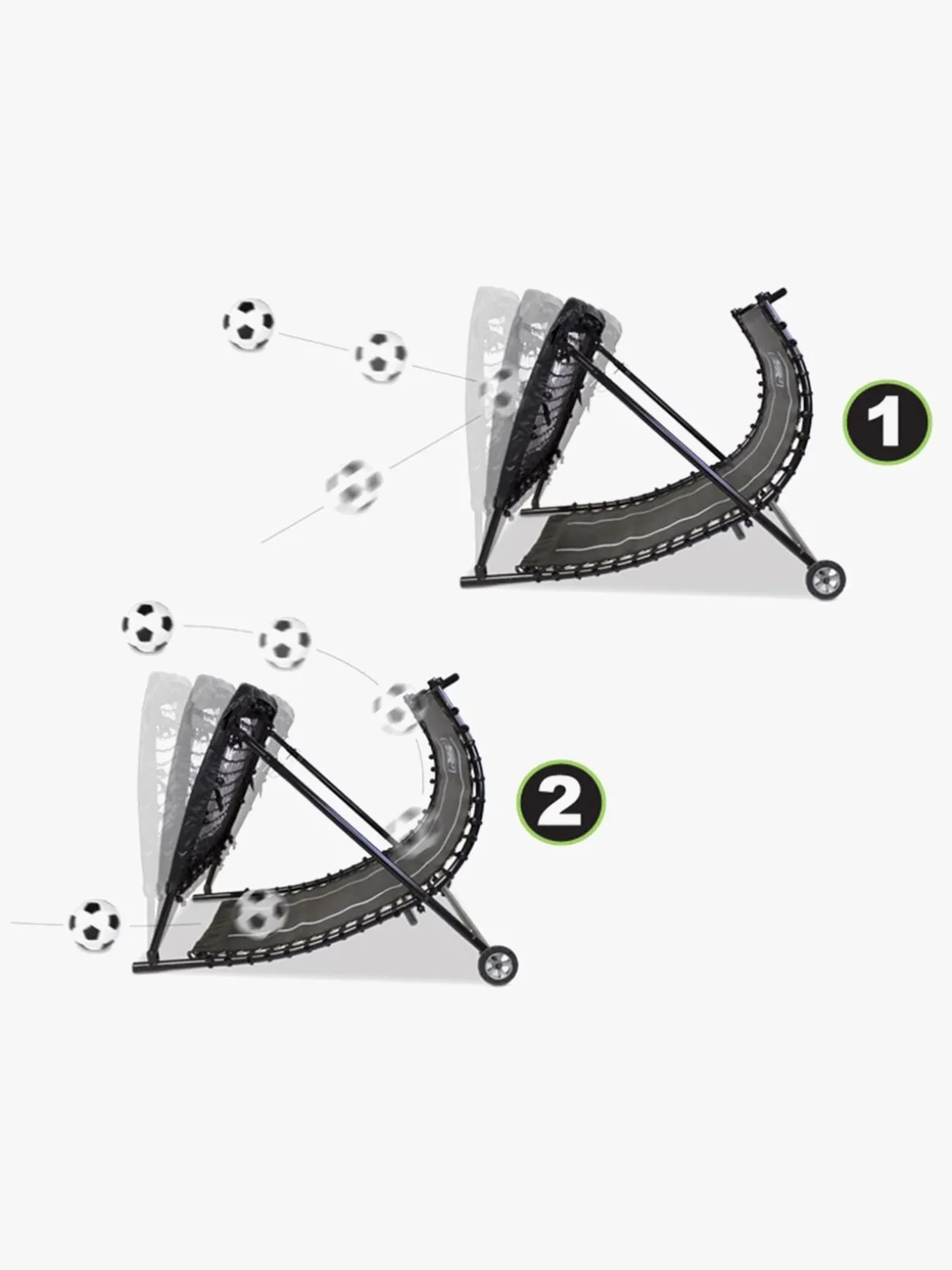 Du kan bruge reboundnettet til at øve spar eller hovedstød ved at justere hældningen mellem 35–90 grader. Hvis du sparker bolden på rampen under nettet, så vender bolden tilbage til dig i forskellige højder og fra forskellige vinkler, så du kan øve dig i at tage imod bolden med fødder, bryst eller hovedet.