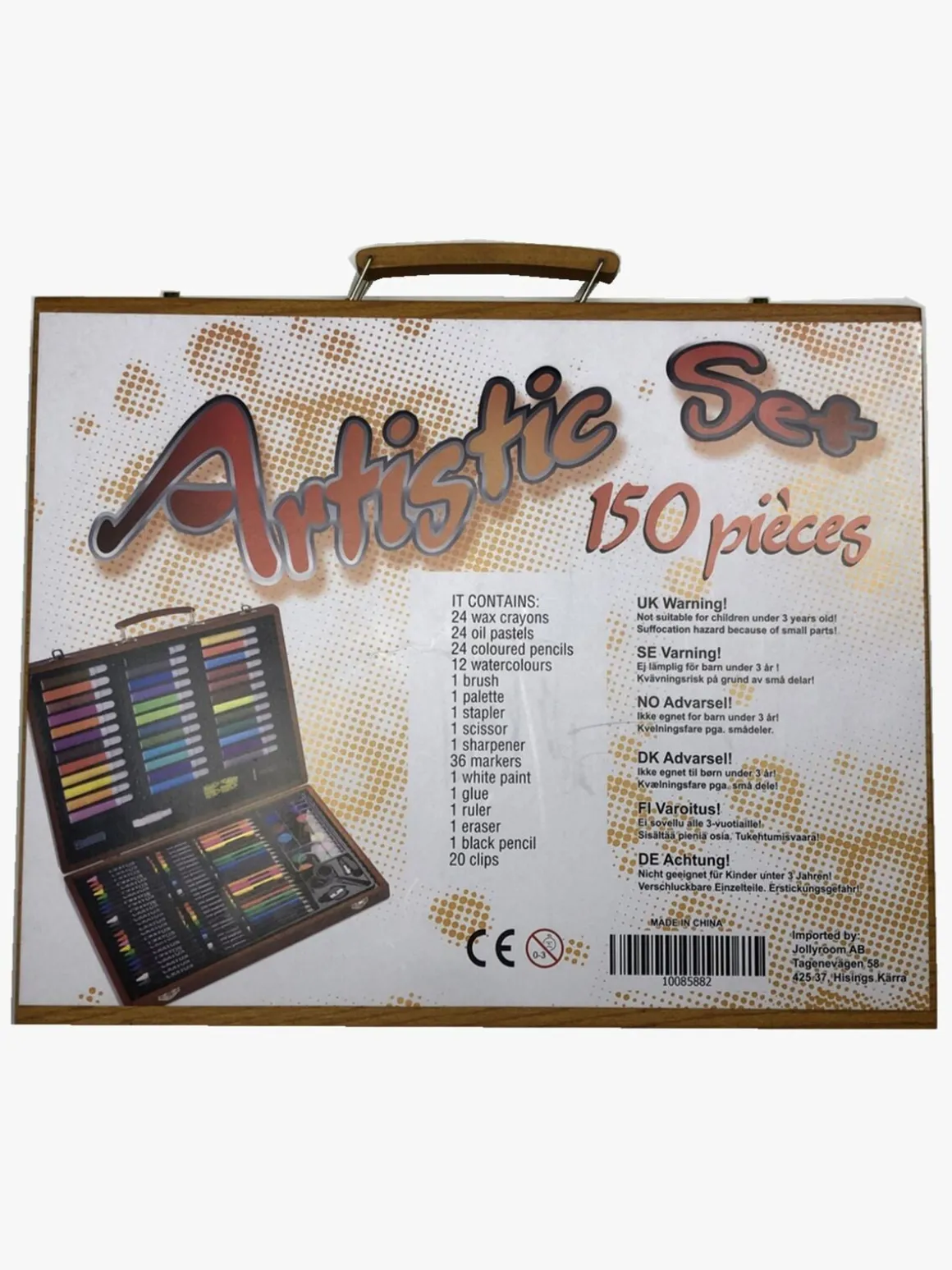 – Indeholder 36 tuscher, 12 vandfarver, 24 stk. pastelkridt, 24 stk. kridt, 24 farveblyanter, clips, en vandbaseret hvid farve, pensel, blyantspidser, blyant, en palet, en svamp, en lineal, en saks og en flaske lim.