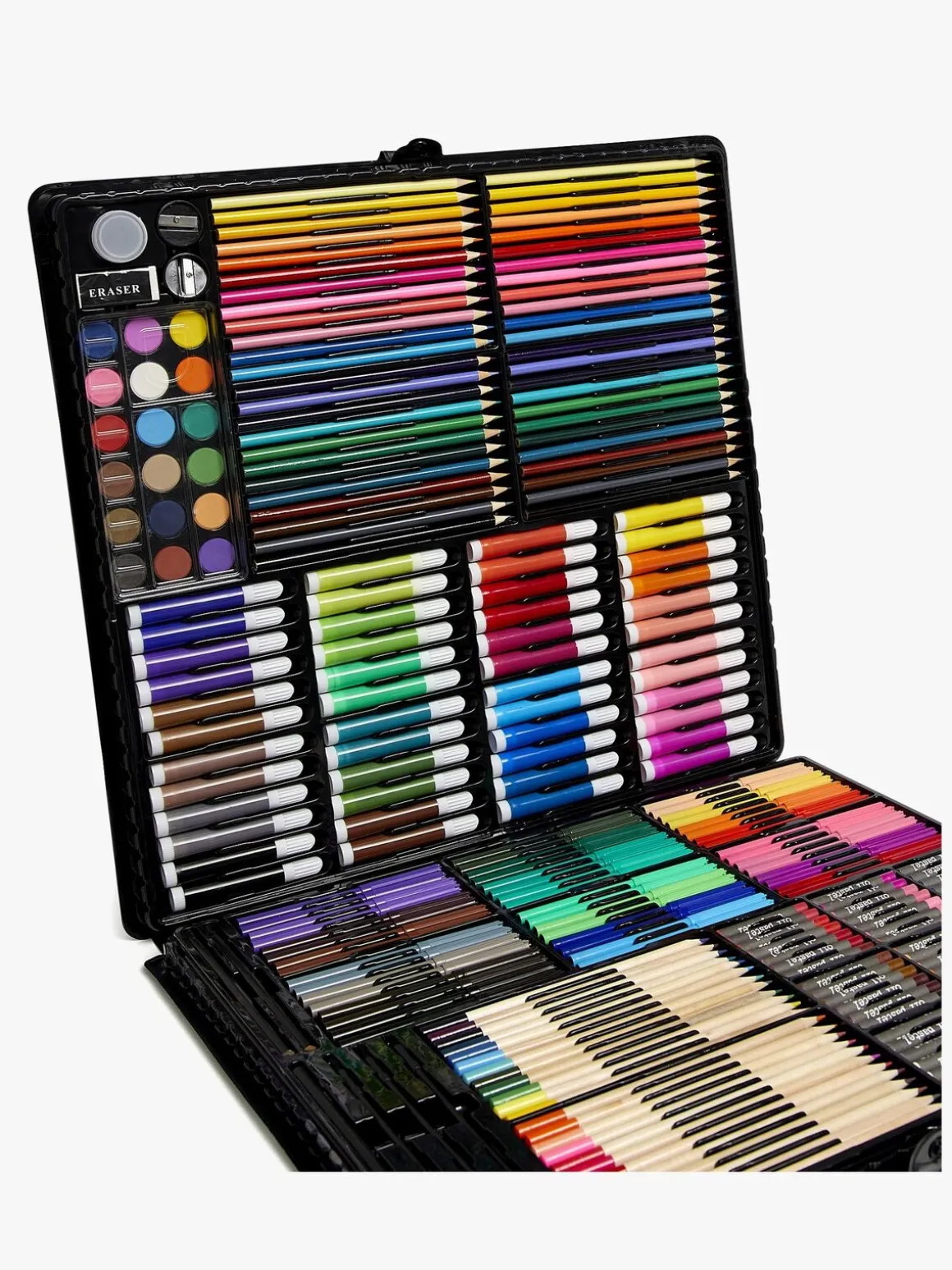 – Indeholder: 48 farveblyanter, 48 fibertusser, 48 spidse tusser, 60 oliepastelfarver, 24 vandfarveblyanter, 18 vandfarver, 3 pensler, 1 palet, 3 blyanter, 2 viskelædere, 2 blyantspidsere.