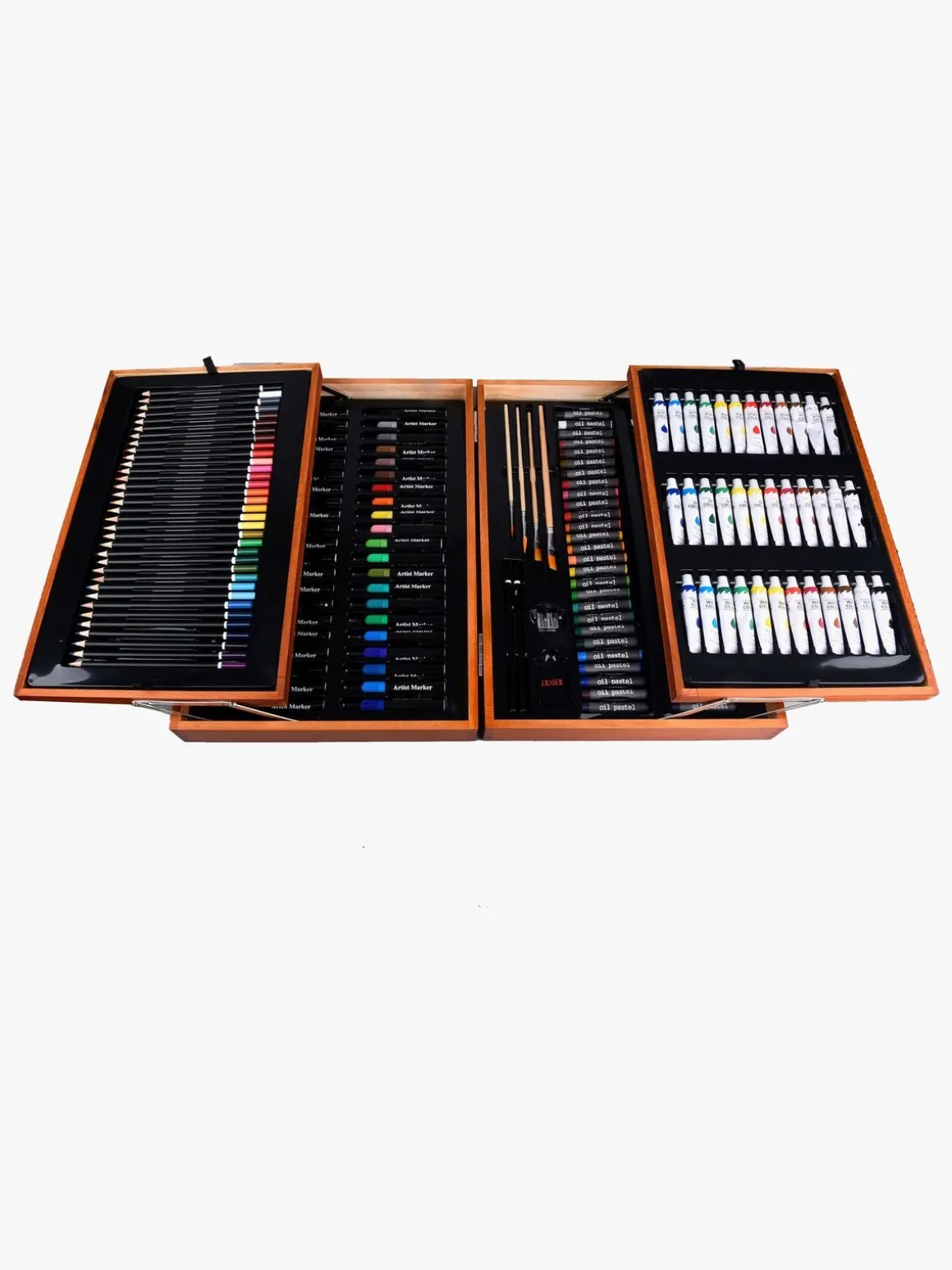 – Indeholder: 12 vandfarver, 12 akrylfarver, 12 oliefarver, 34 farveblyanter, 54 oliepastelfarver, 42 tusser, 2 HB-blyanter, 4 pensler, 1 blyantspidser, 1 viskelæder.