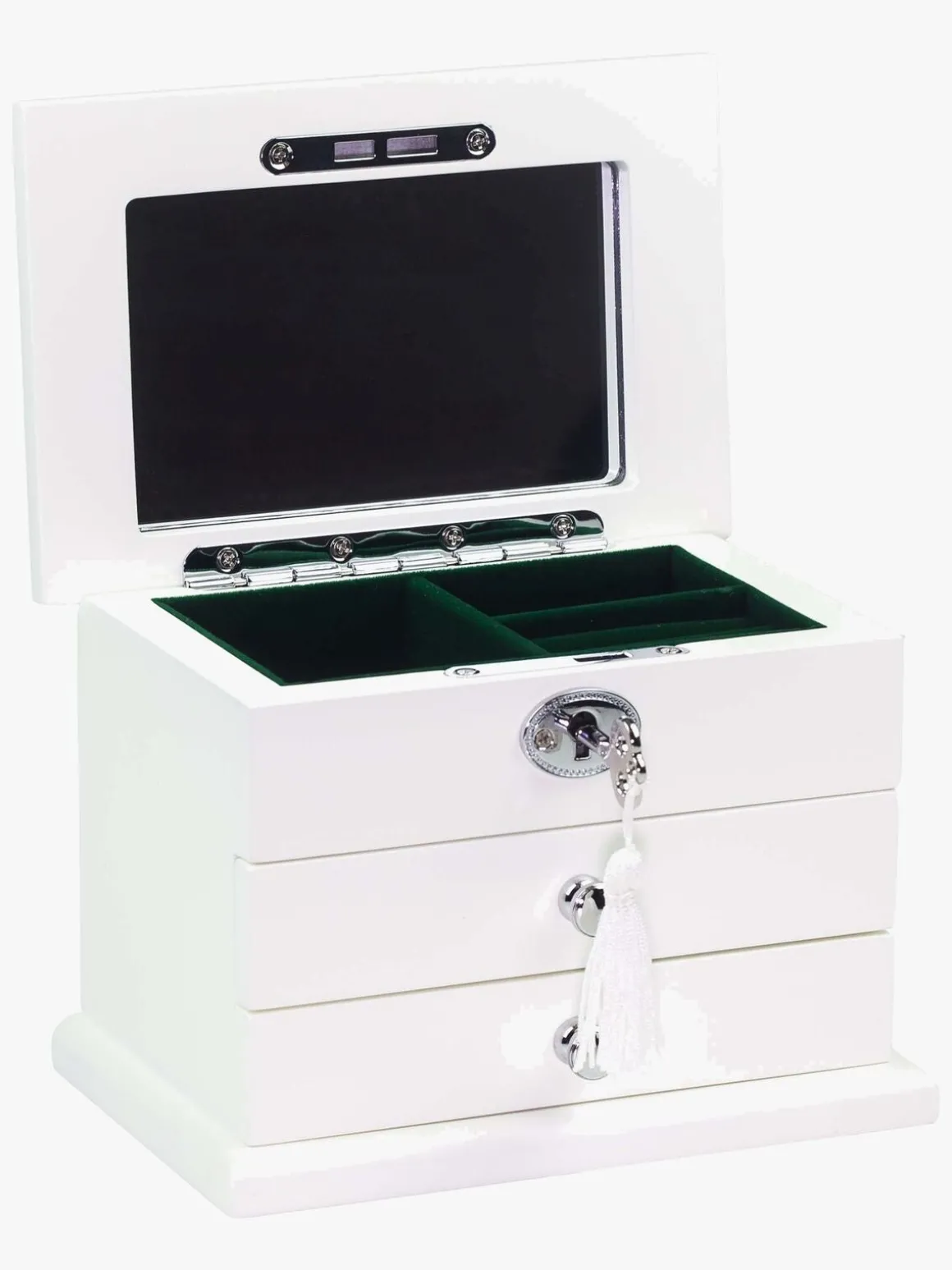 Det er hvidt udvendigt, og indersiden er iklædt møkregrøn velour. Låget til overdelen åbnes med en metalnøgle, der er dekoreret med kvast. De to skuffer nederst giver ekstra opbevaringsplads til forskellige smykker.