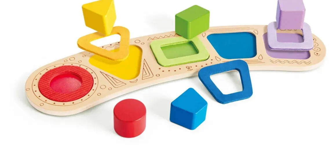 – Indeholder: 1 puslespilsbræt, 5 træklodser med forskellige former og farver, 5 tekstilbrikker, der matcher klodsernes former.