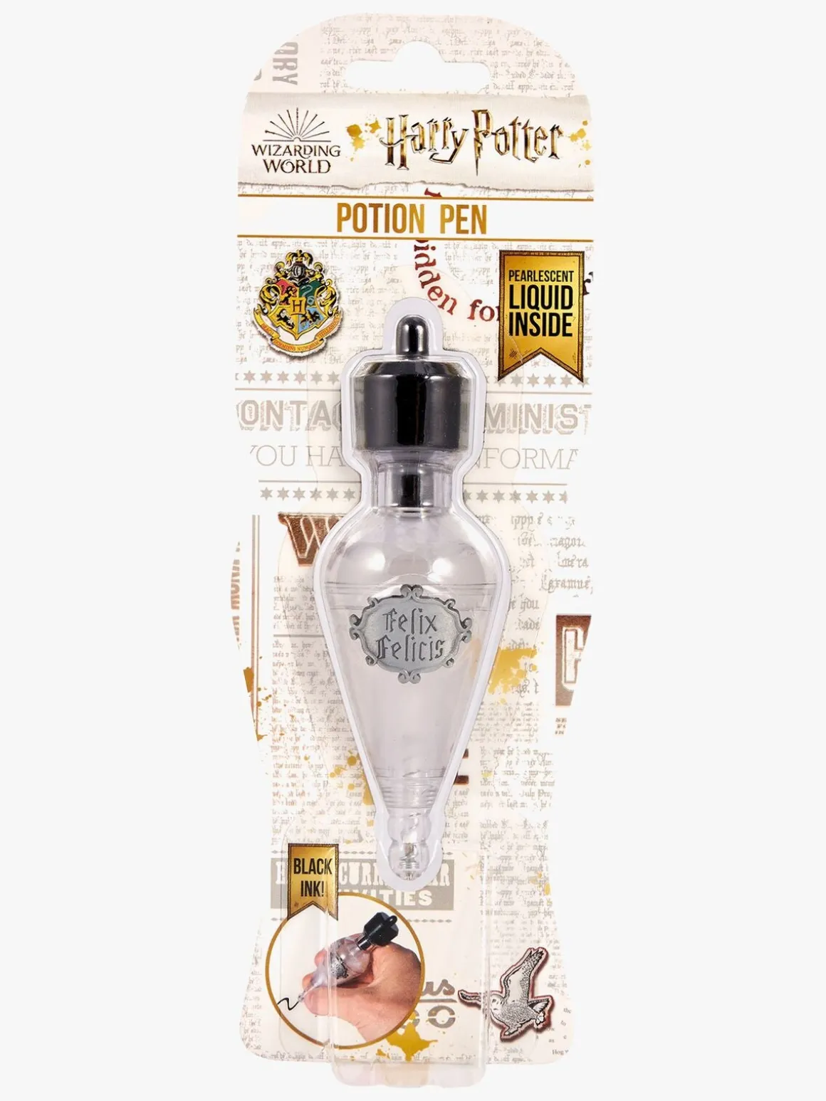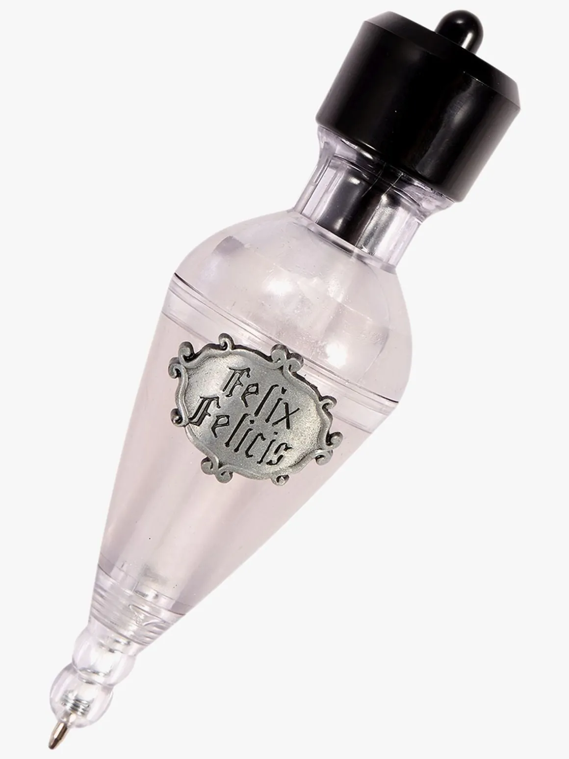 En sej kuglepen med Harry Potter-tema, der forestiller en flaske med hvidt skinnende væske i form af trylledrikken, Felix Felicis. Kuglepennens blæk er sort.