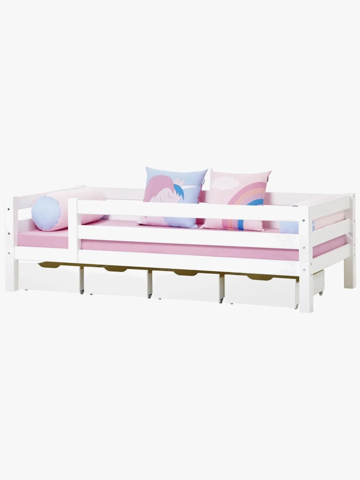 Under juniorsenge med målene 70 x 160 cm er der plads til tre stk. sengeskuffer.