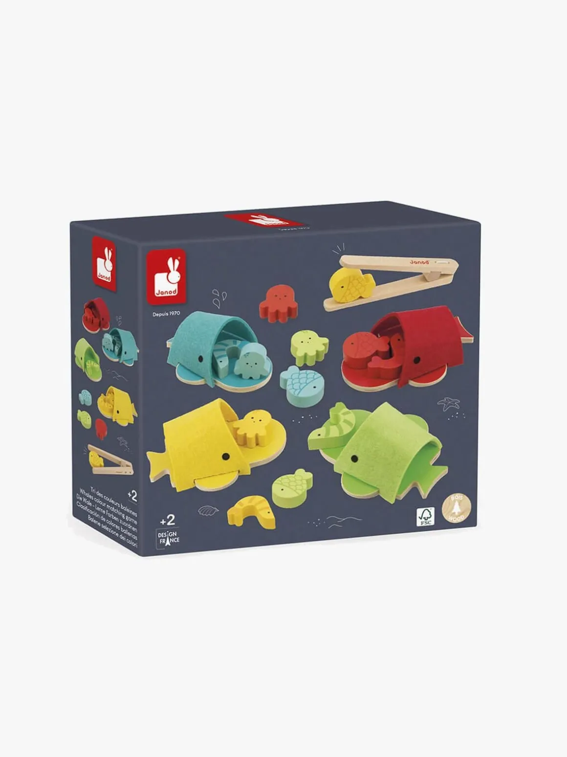 – Fang de små havdyr ved hjælp af trætængerne og placér dem i munden på hvalen med den modsvarende farve.