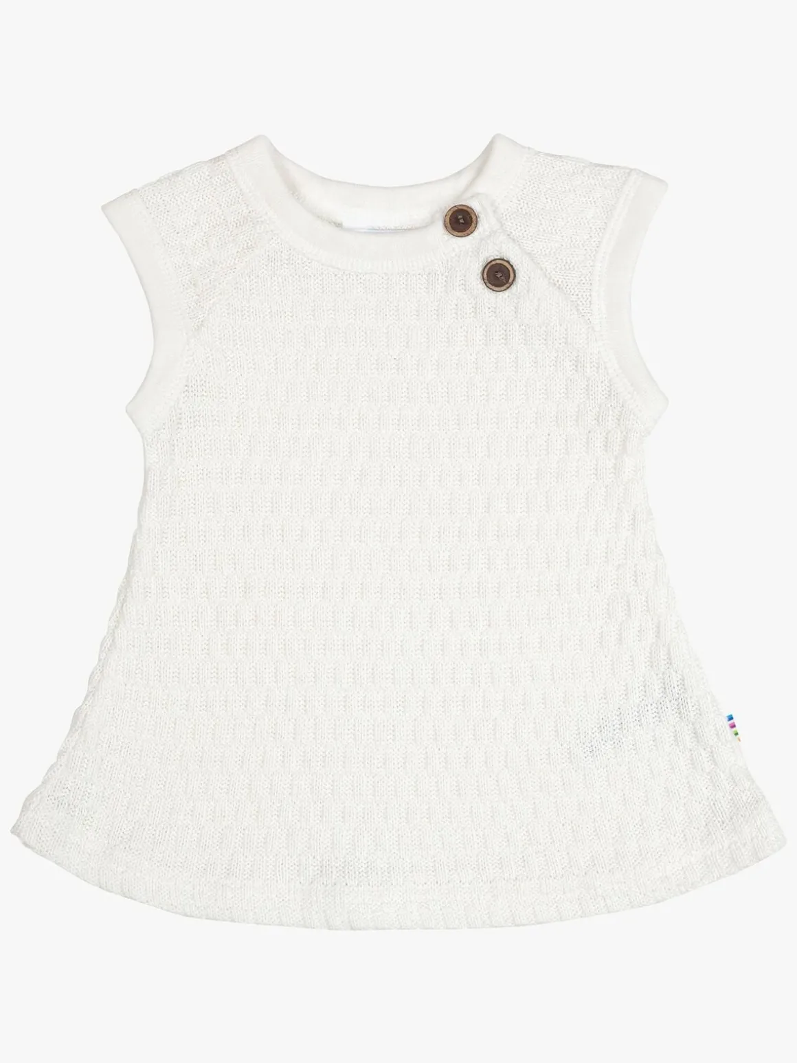 En sød strikket kjole fra Joha til de yngste. Den er lavet i økologisk bomuld med to trykknapper i tiden af kragen og er passer perfekt til hverdag eller festlige sammenkomster. Bomulden er svanemærket, hvilket gør kjolen til et miljøvenligt valg.