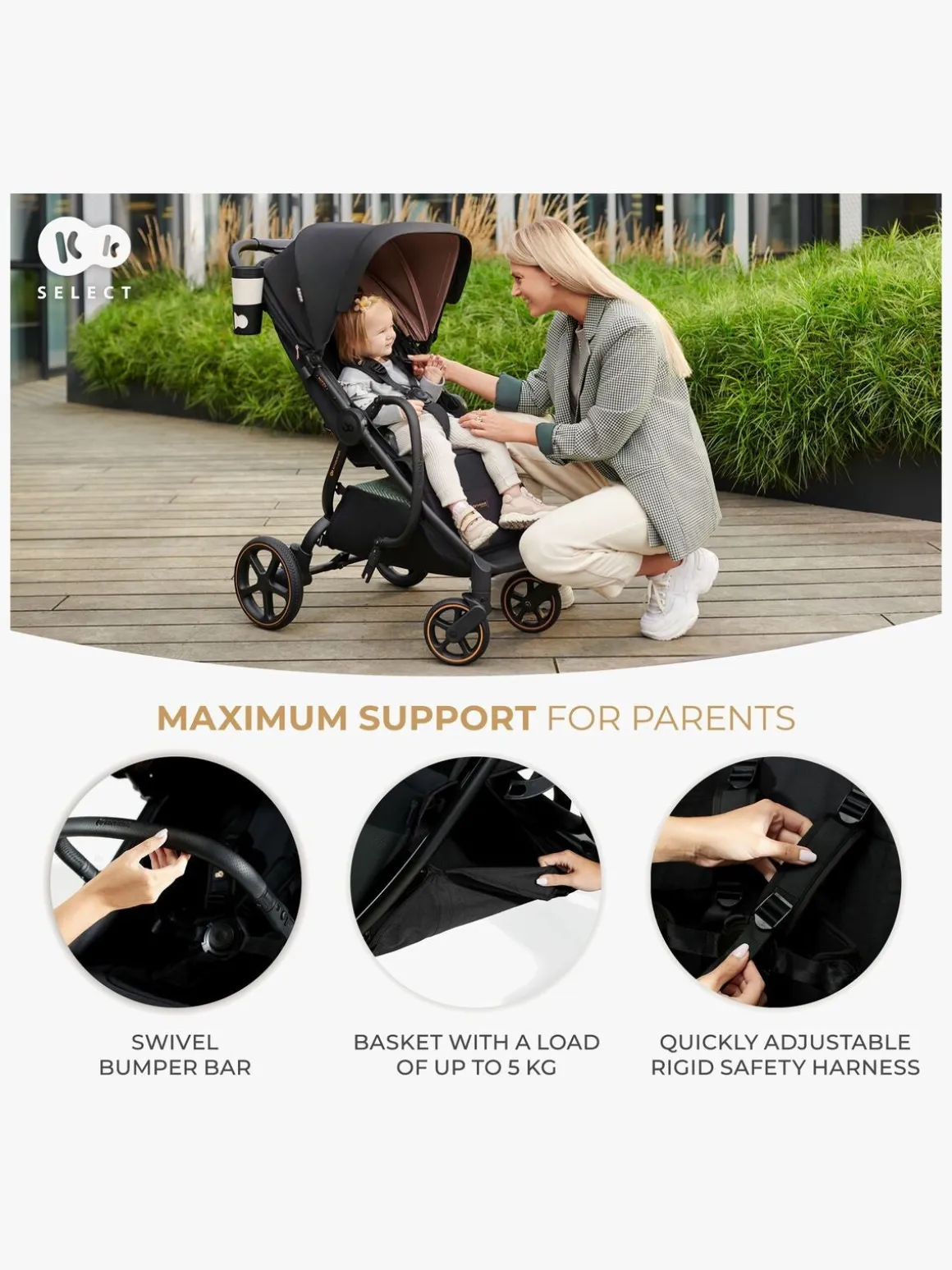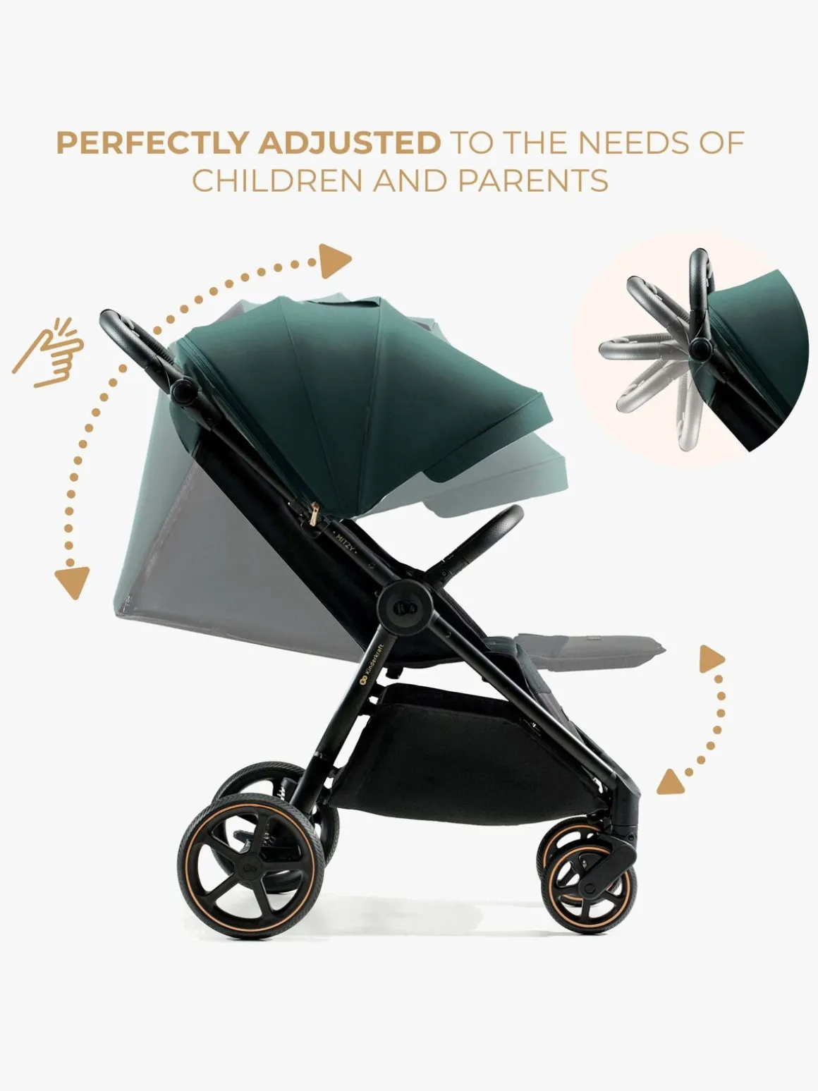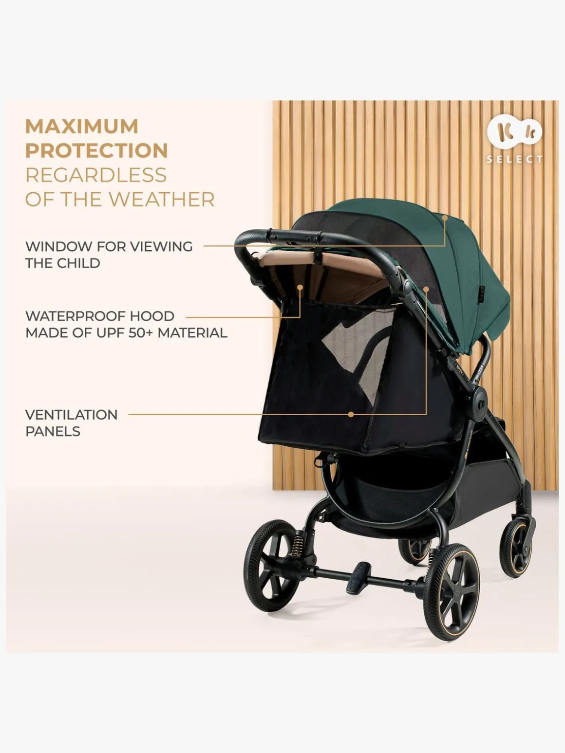 – Stor kaleche med vandtæt belægning og UPF50+.