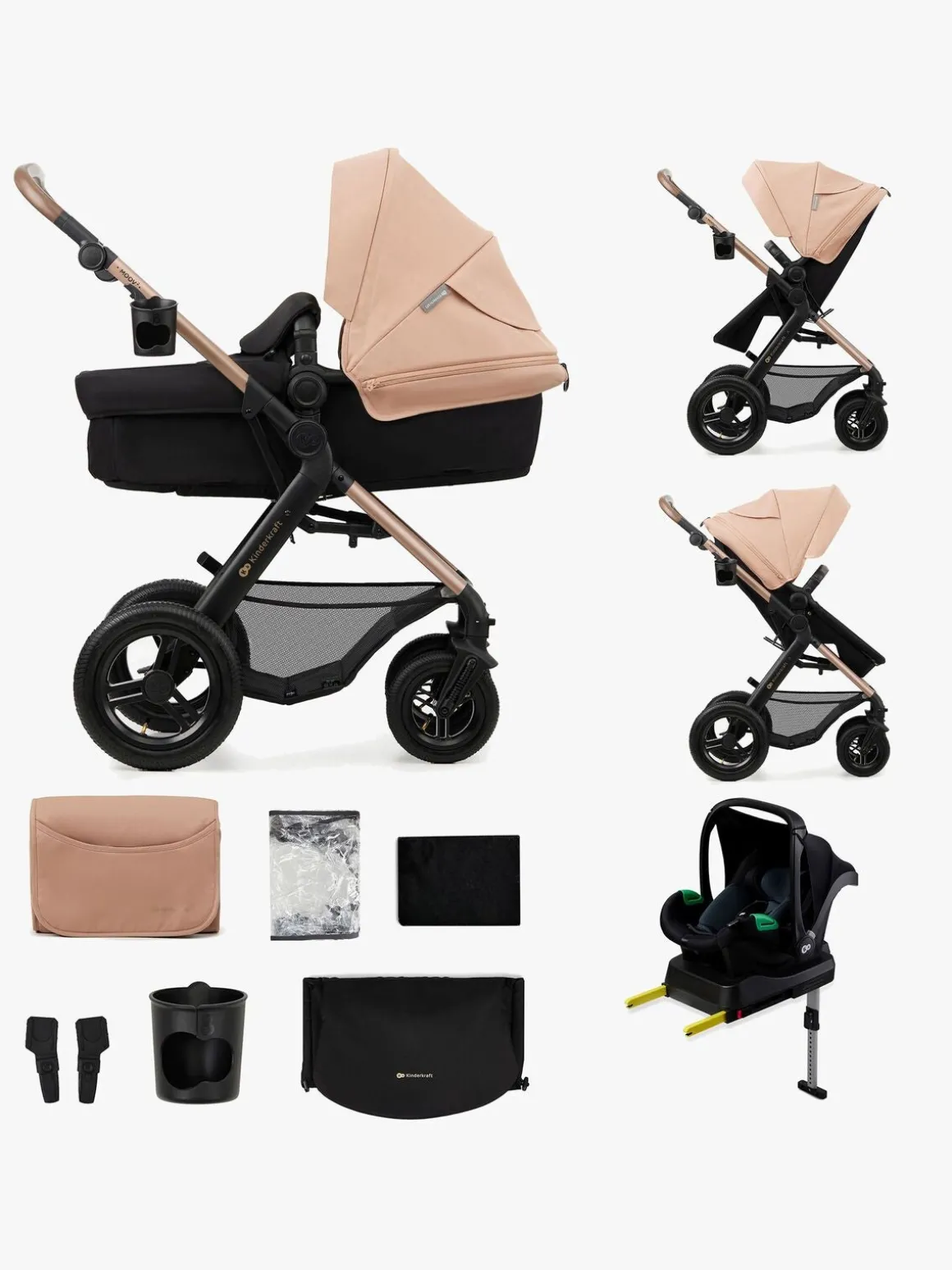 – Inkluderer: regnslag, myggenet, kørepose, taske, kopholder, babyautostol, base, adapter.