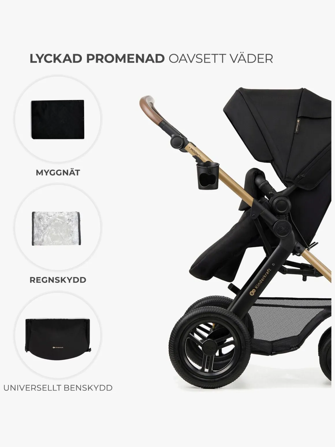 – Inkluderer: regnslag, myggenet, kørepose, pusletaske, adapter, kopholder.