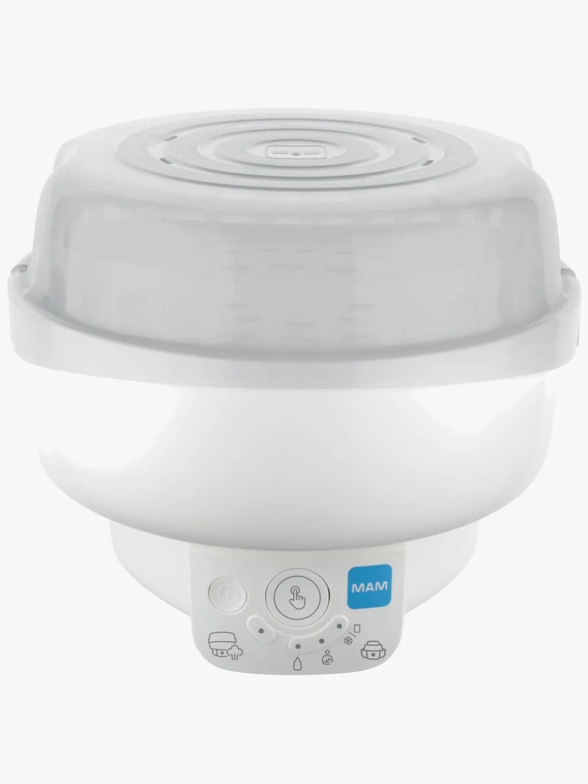 Praktisk, hvid 6-in-1 elektrisk sterilisator fra MAM med en flaskevarmer. Den har mange praktiske funktioner. Perfekt til at hjælpe dig med at rengøre sutteflasker og opvarme mad til babyen.