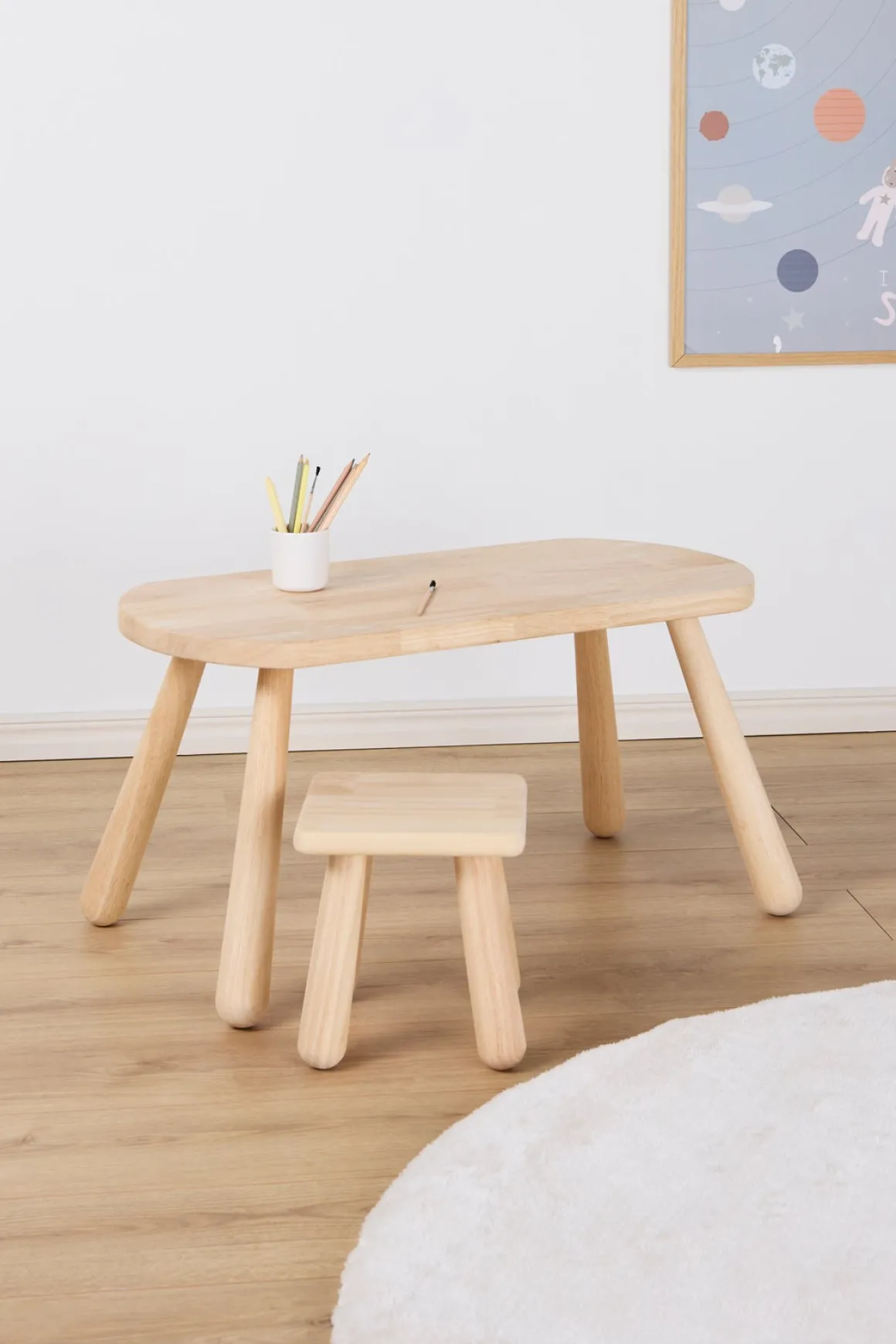 Der medfølger en stilfuld skammel fra Minitude med en stabil konstruktion. Perfekt til børneværelset eller ethvert andet rum i hjemmet.