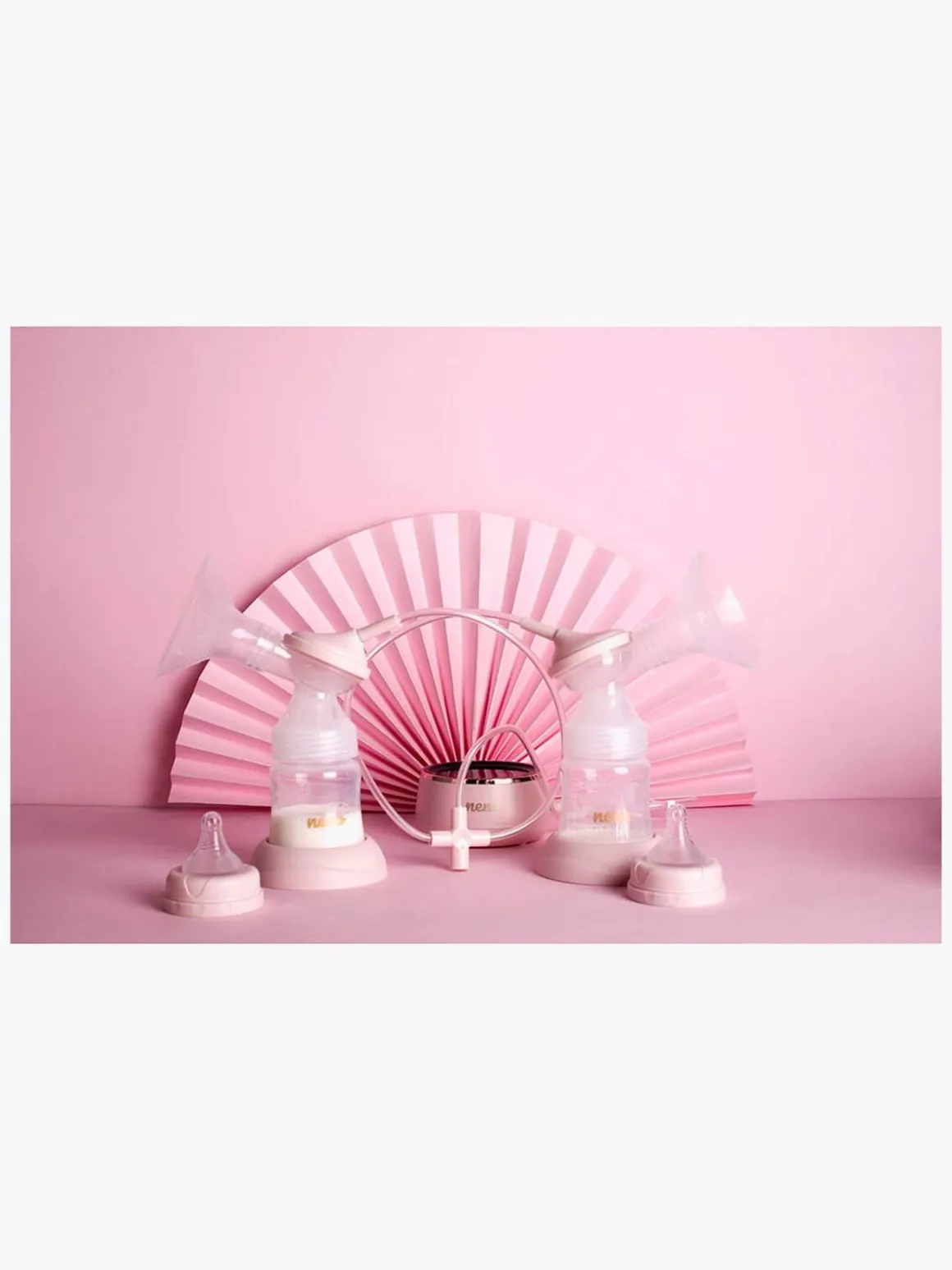 I dette sæt får du pumpenheden, to mælkeflasker og to sutter. Ingen del af brystpumpen indeholder BPA, hvilket gør den sikker at bruge. Der er et genopladeligt Lithium-lon batteri i produktet, som oplades med et USB-C kabel.