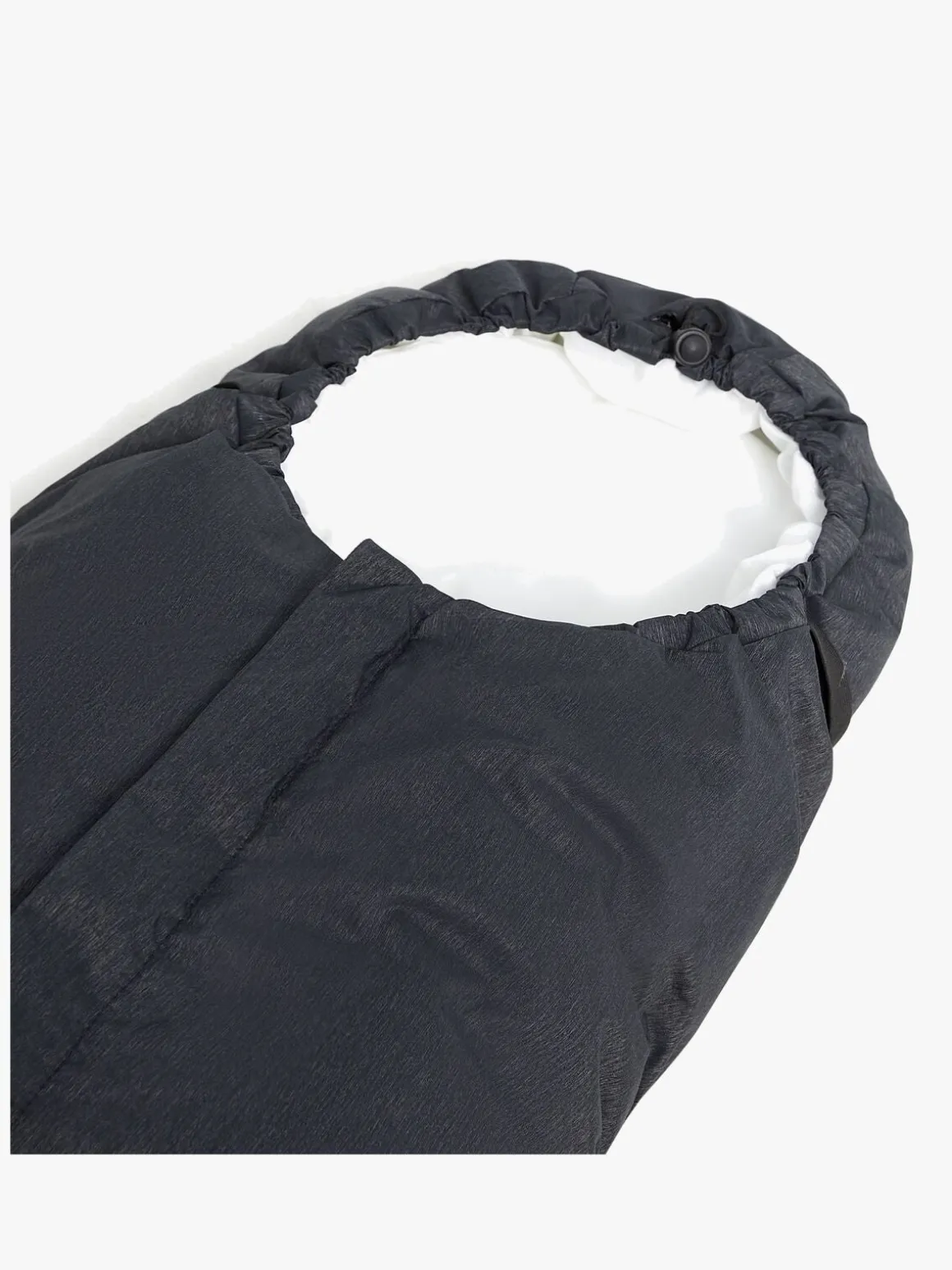 Køreposen har udtag til fempunktssele, og på bagsiden, er der en elastikrem, der kan fastgøres omkring barnevognens frontdel for at sikre, at køreposen ikke glider ned.