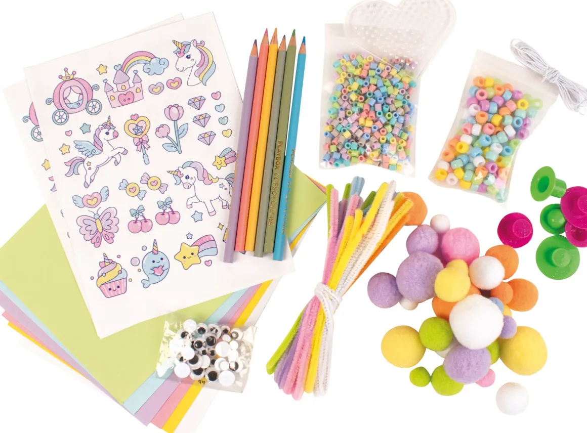 – Forskellige hobbymaterialer i pastelfarver.