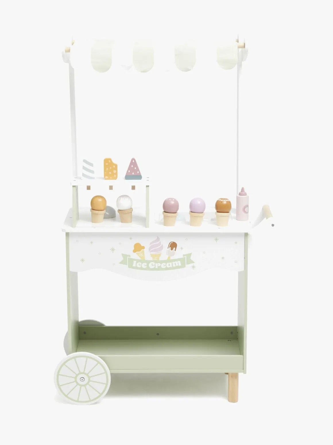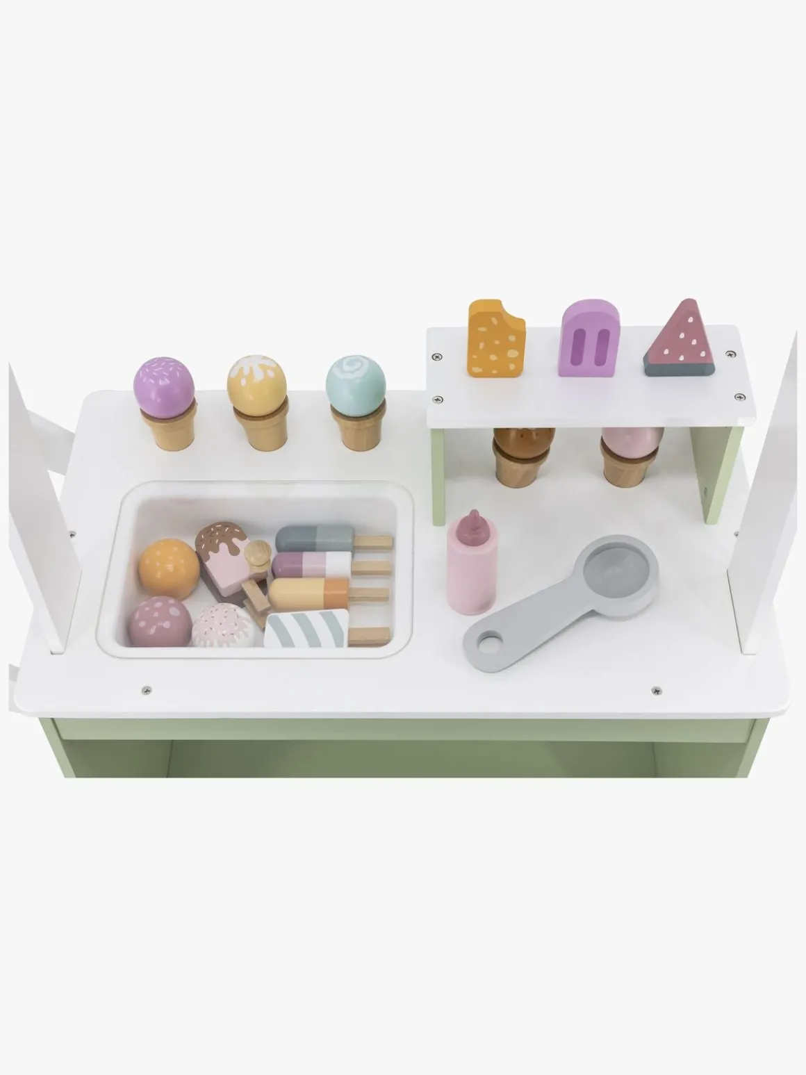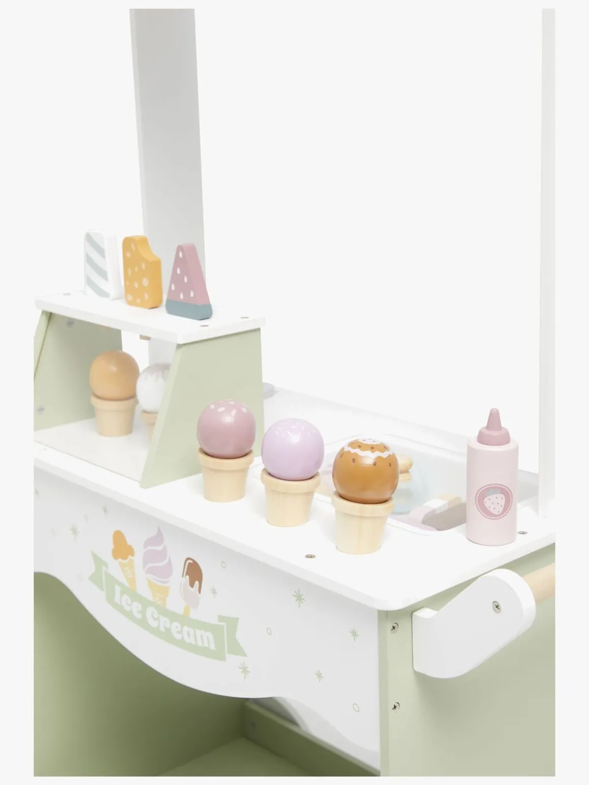 – Indeholder en isvogn med flere forskellige slags iskugler, vafler, pindeis, jordbærtopping og en isske.