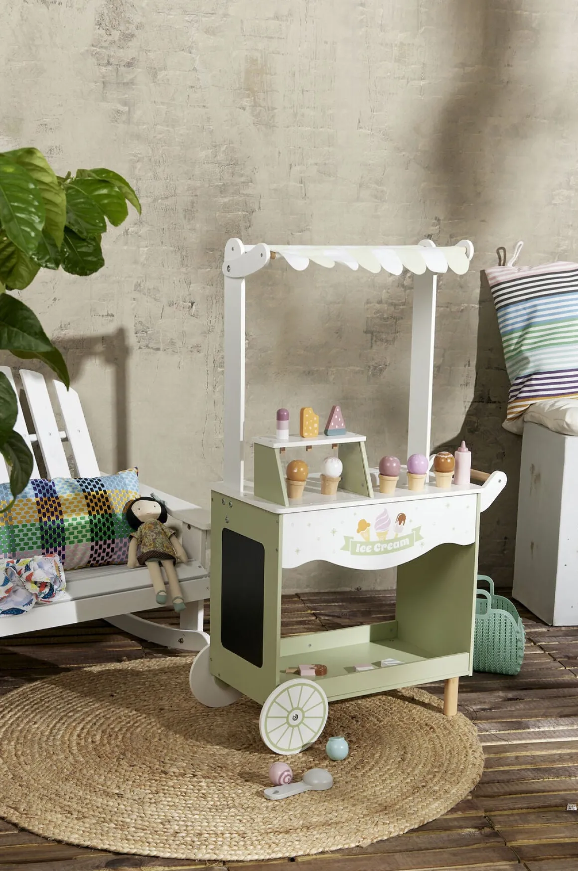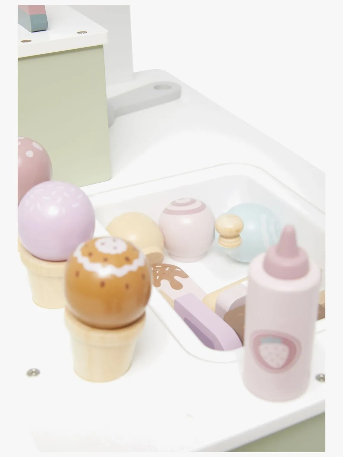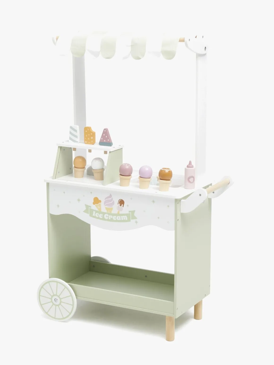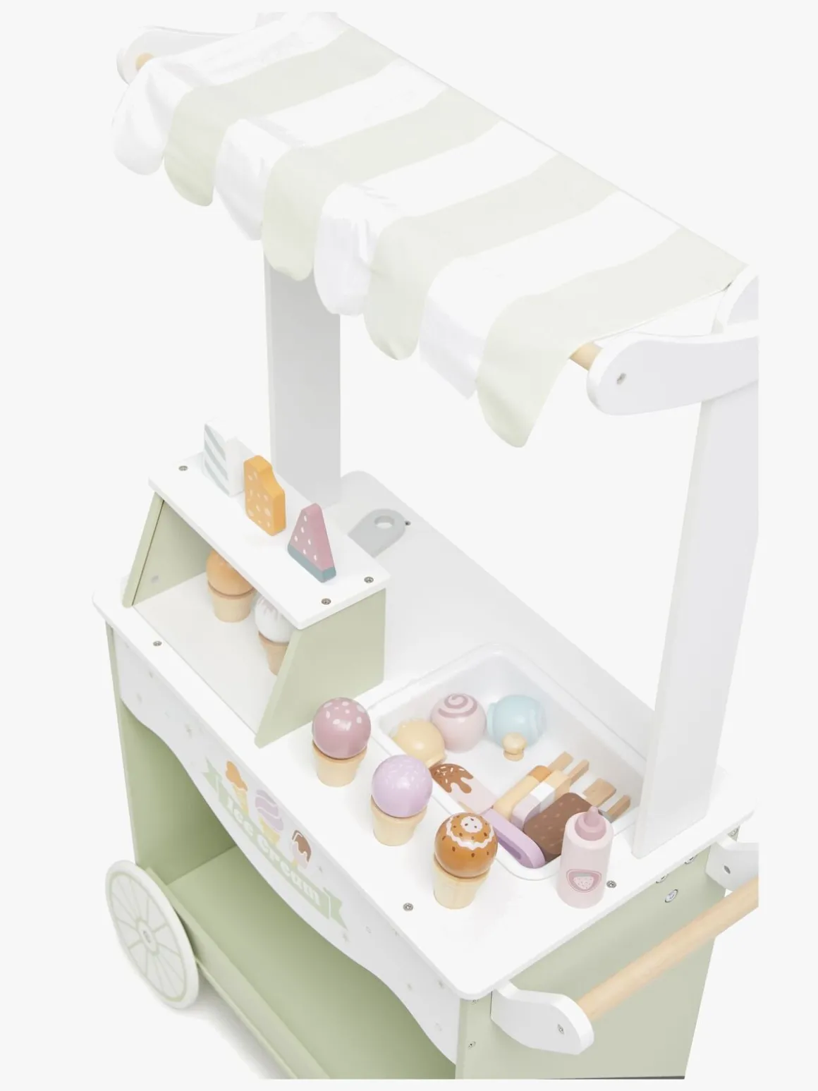– Indeholder en isvogn med flere forskellige slags iskugler, vafler, pindeis, jordbærtopping og en isske.