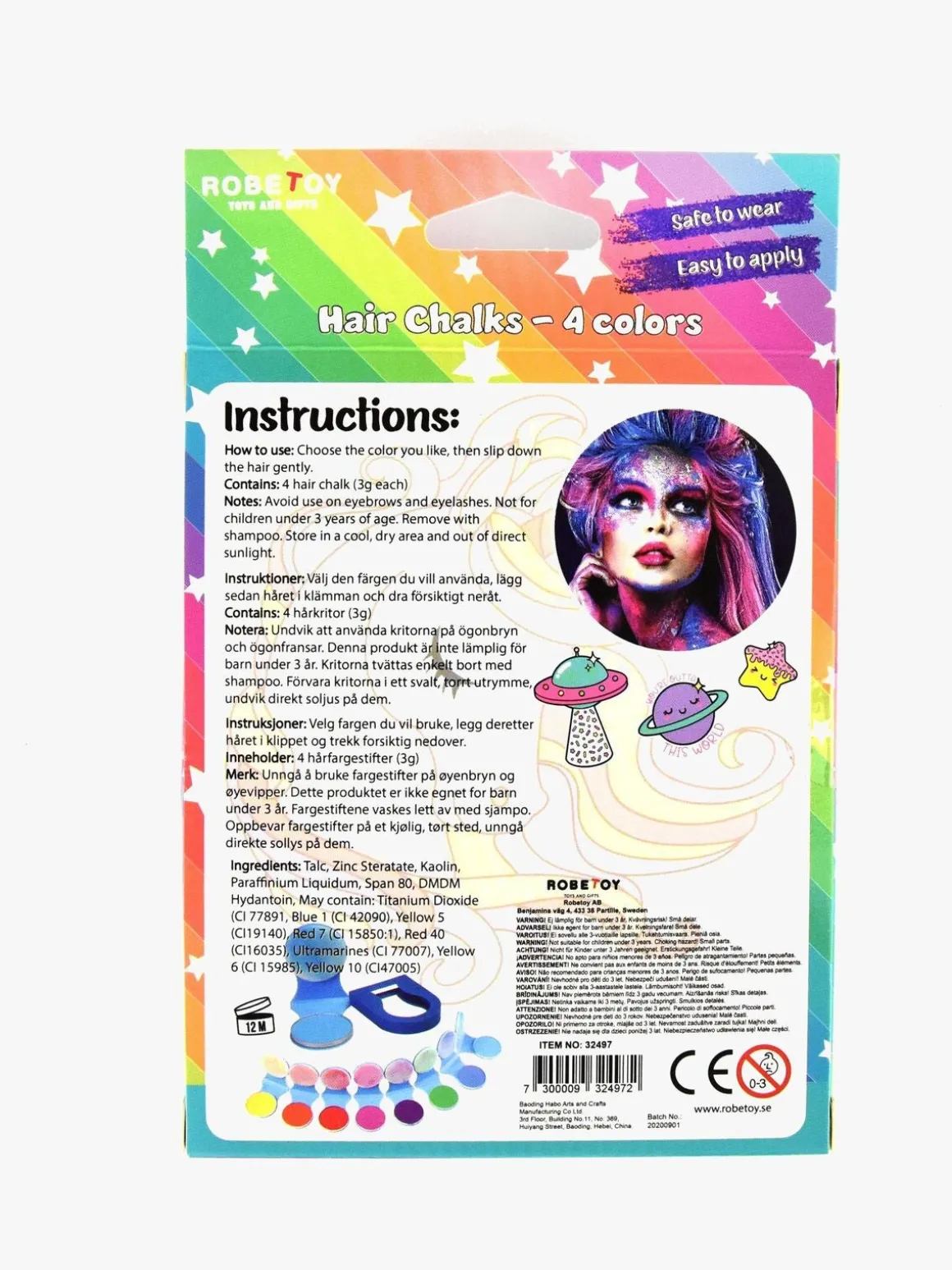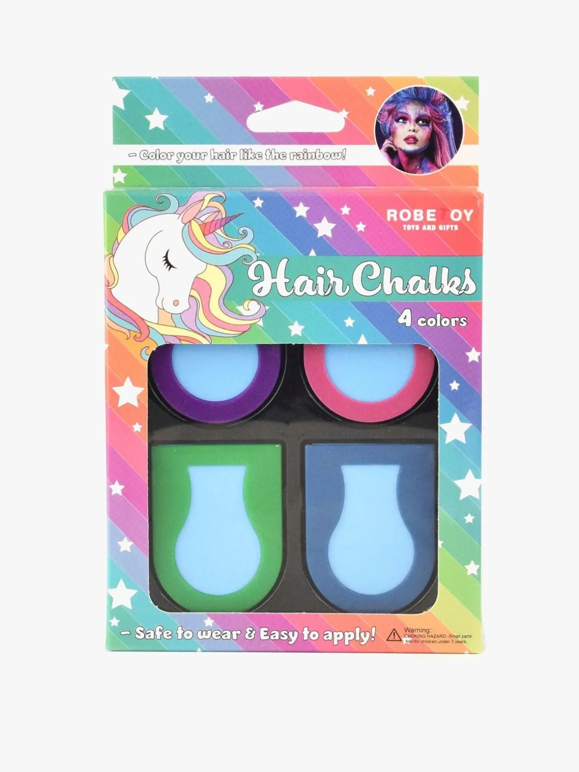 Farv håret, hurtigt og let med disse smarte hårkridt fra Robetoy. Sættet indeholder fire kridt i forskellige farver; lilla, lyserød, grøn og blå. Vælg den farve du bedst kan lide, sæt håret i spændet og træk forsigtigt nedad. Farven er let at vaske af med vand og shampoo.