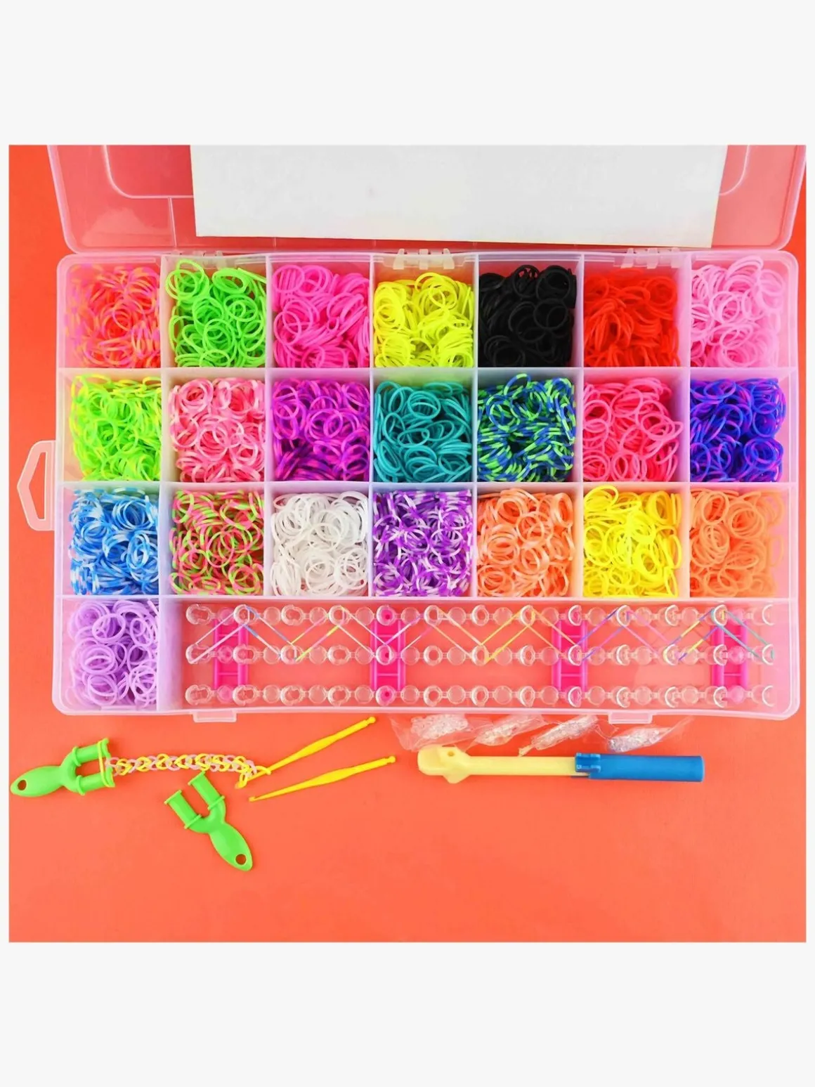 – Indeholder: 5600 loombånd, 1 opbevaringskasse, 96 klips, 1 stor loom-krog, 2 små loom-kroge, 2 Y-kroge, 1 brugsvejledning.