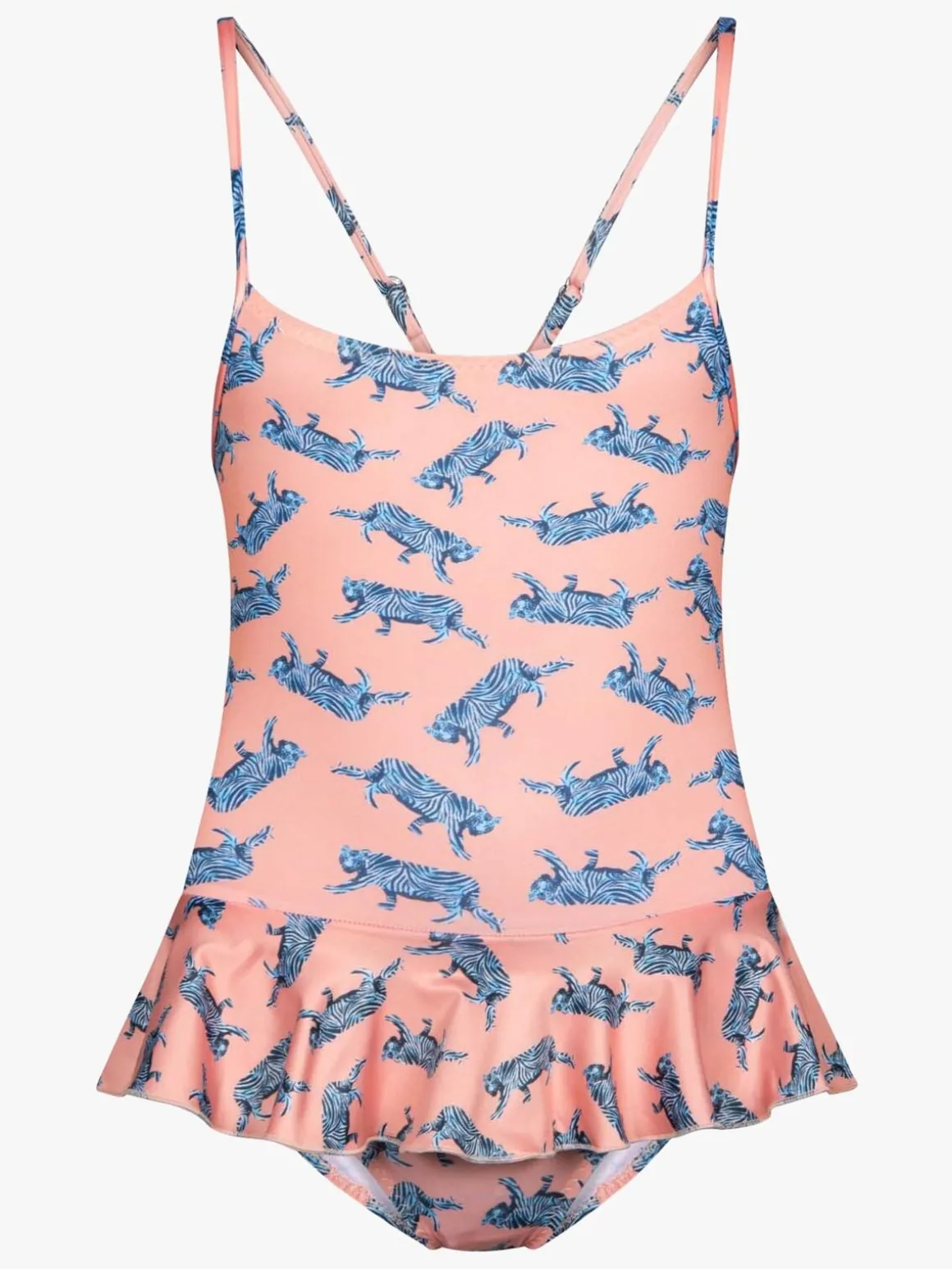 Dejlig badedragt fra Saltabad med tynde krydsende skulderstropper, lille flæsenederdel og et skønt mønster. Perfekt til stranden eller hjemme ved poolen.