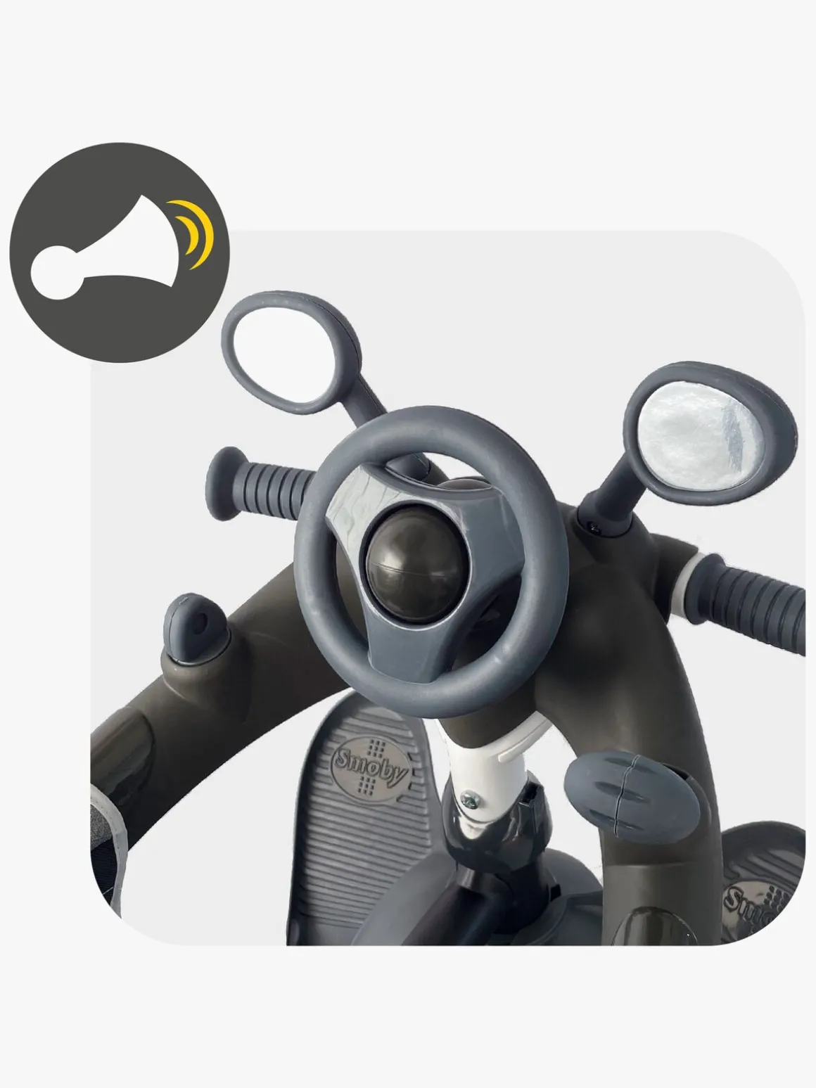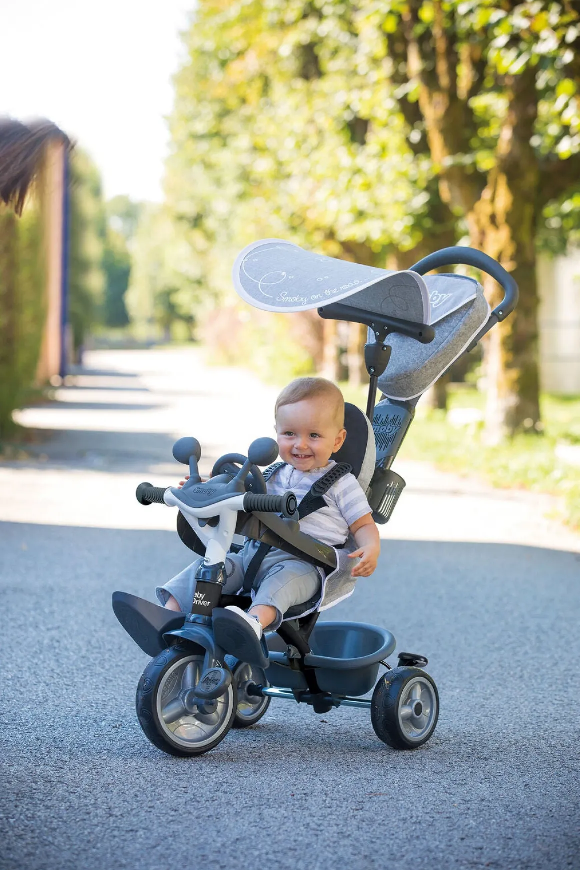Sædet kan justeres i to forskellige positioner og er forsynet med et behageligt ryglæn, solskærm og en sikkerhedsbøjle, der efterlader god plads til barnets ben. Den trehjulede cykel er også udstyret med et håndtag, som den voksne kan holde i og give lidt ekstra fart, når de små ben er blevet trætte.