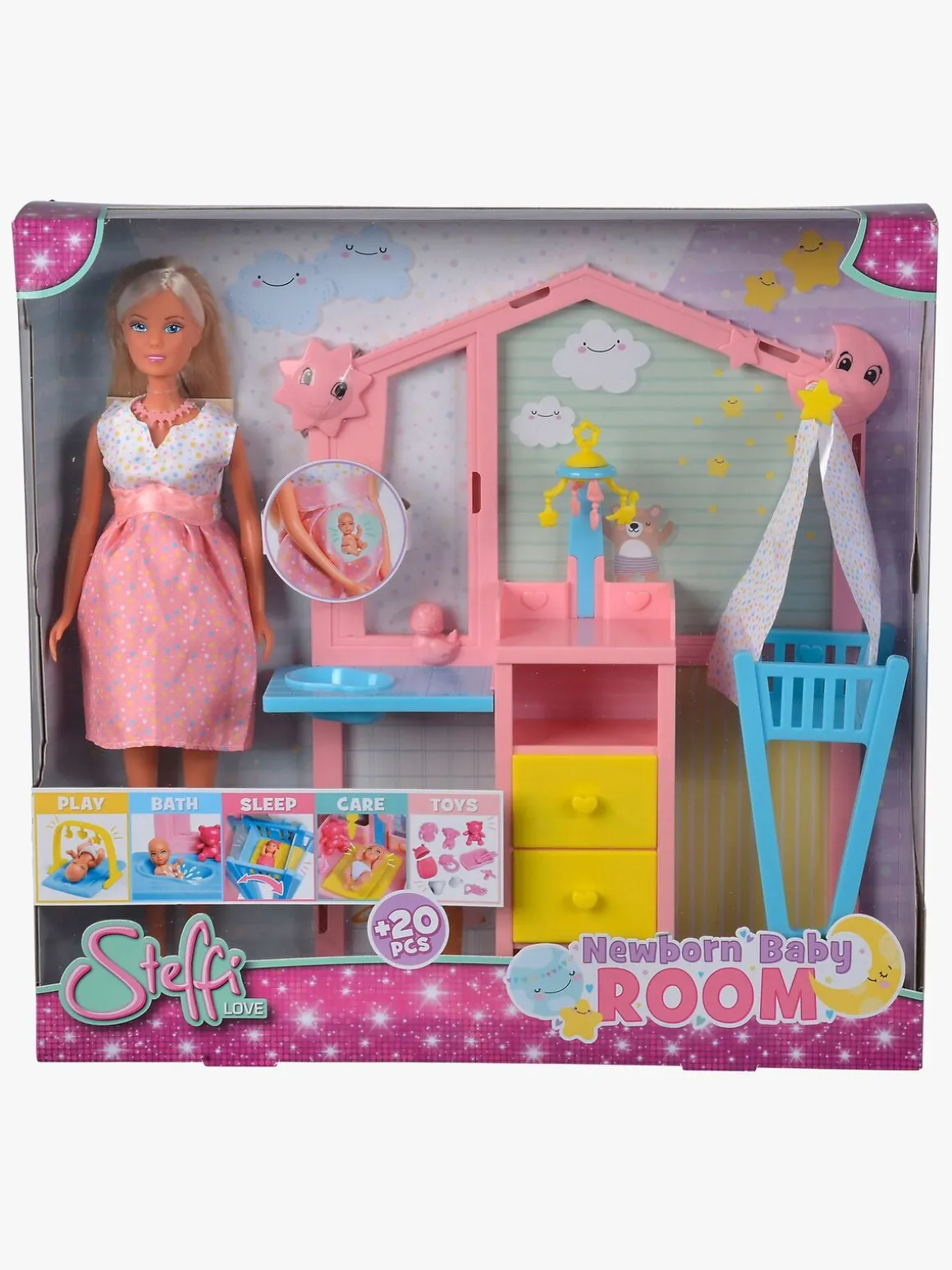 – Indeholder: 1 Steffi-dukke, 1 baby, 1 babyværelse, 1 aktivitetscenter, 15 babytilbehør.