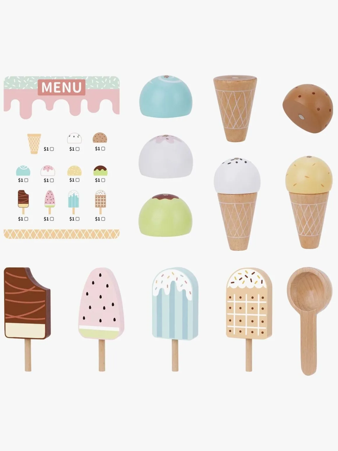 – Indeholder: 1 iskiosk, 1 menu, 1 isske, 10 is, 3 isvafler.