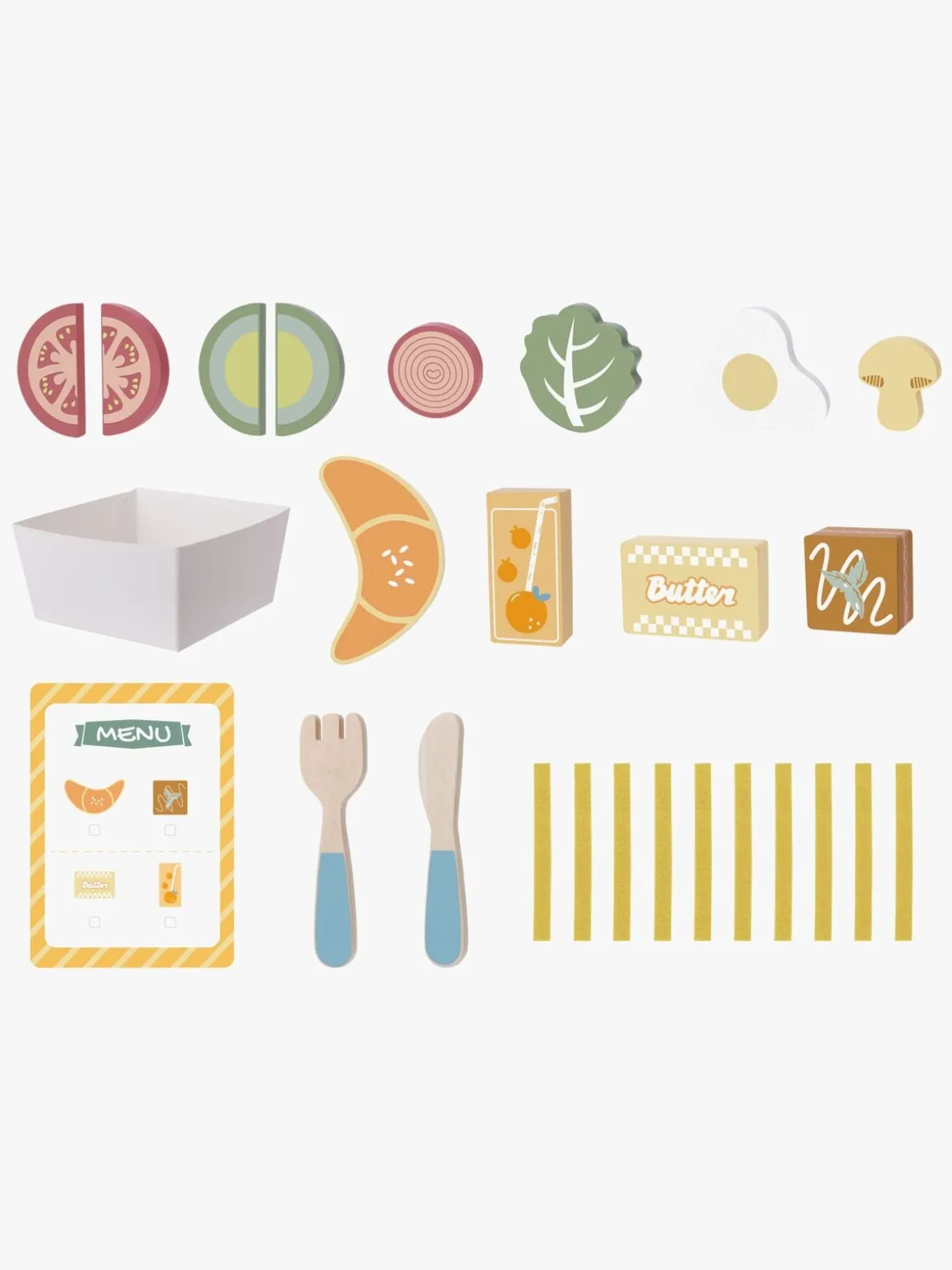 – Indeholder: 1 bakke, 1 skål, 1 gaffel, 1 legetøjskniv, 1 menukort, 20 fødevarer.