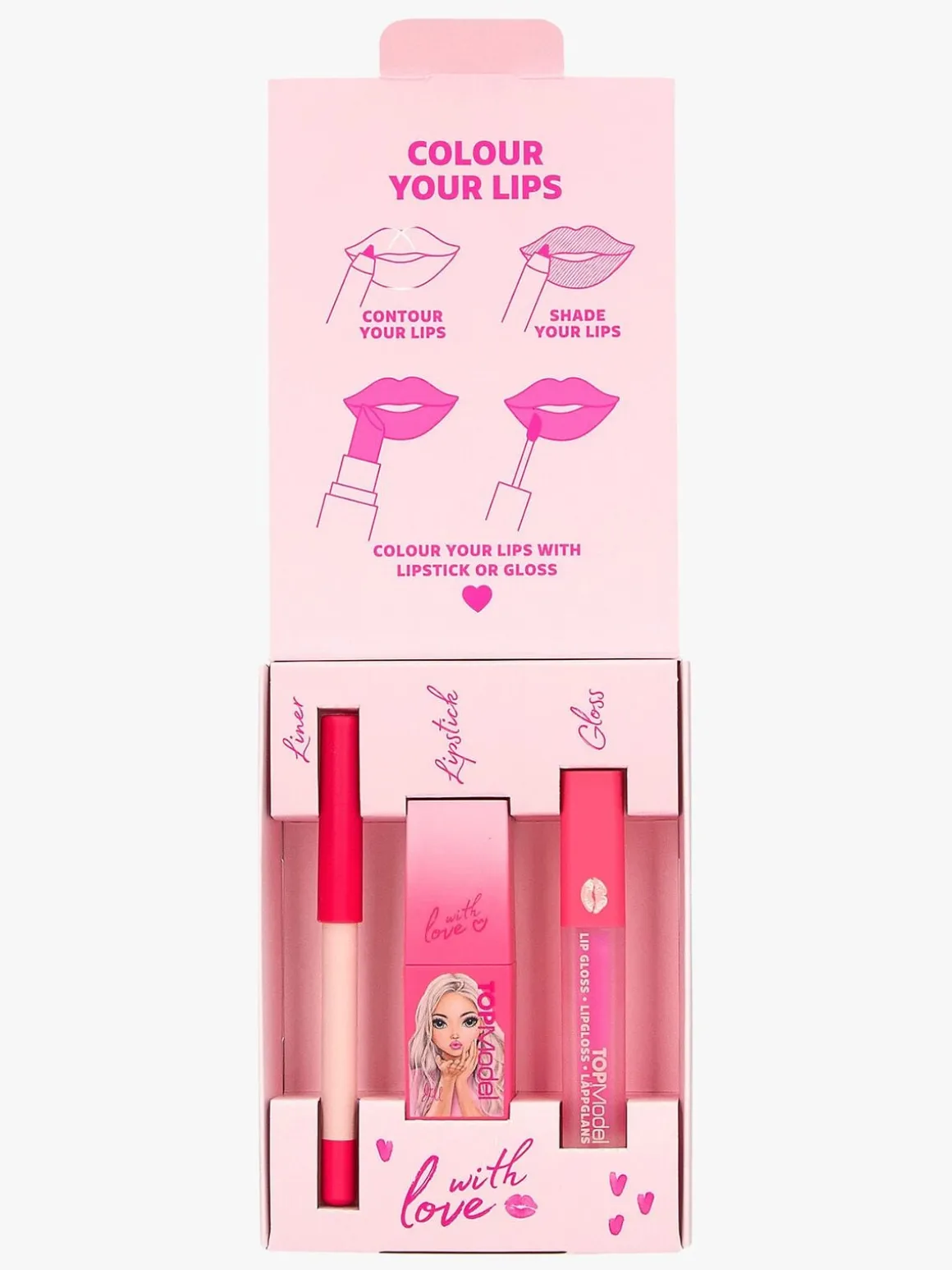 – Indeholder: 1 læbeblyant, 1 læbestift, 1 lipgloss.