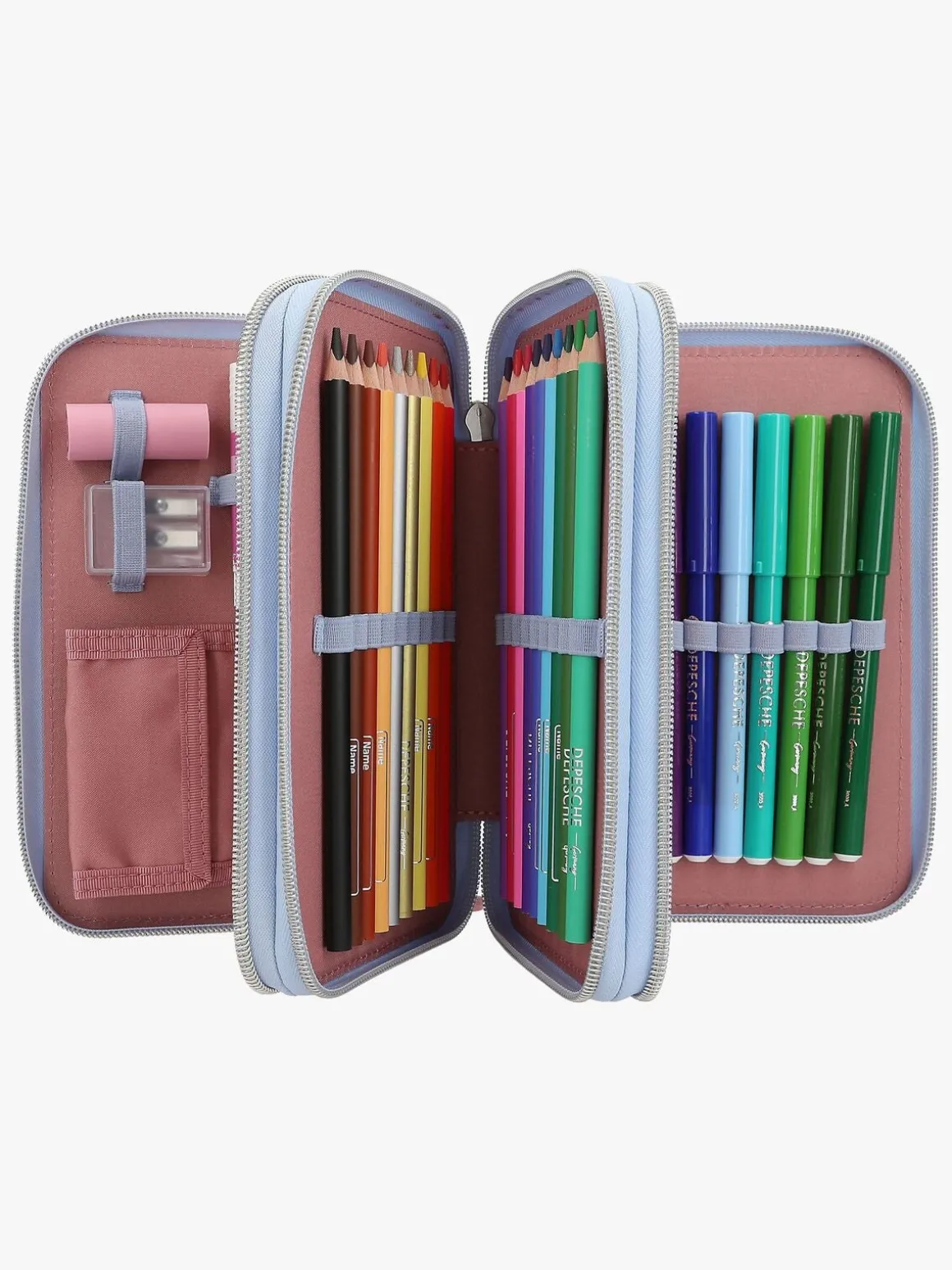 – Indeholder: 1 penalhus, 18 farveblyanter, 18 tusser, 2 blyanter, 1 saks, 1 limstift, 1 blyantspidser, 1 lineal, 1 viskelæder.