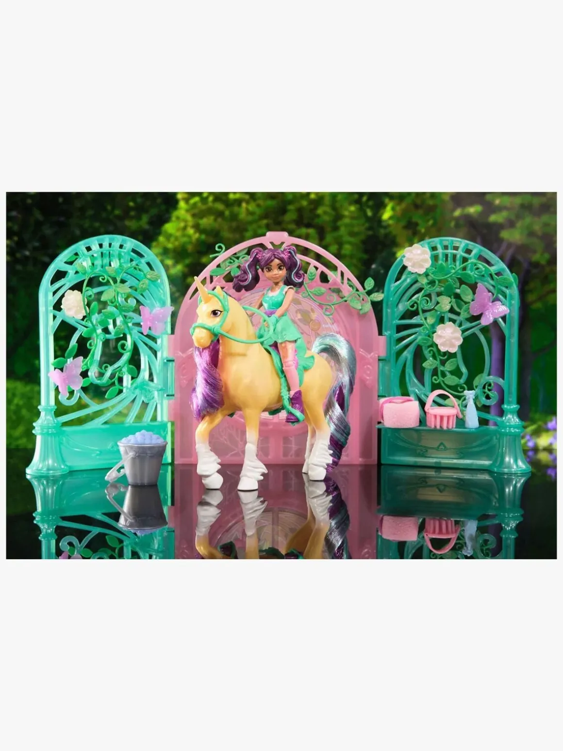 – Indeholder: 1 dukke, 1 enhjørning, 1 staldvæg med sommerfugle og blomster, 1 sadel, 1 hovedtøj, 1 spand, 1 vaskesvamp, 1 sprayflaske, 1 strigle.