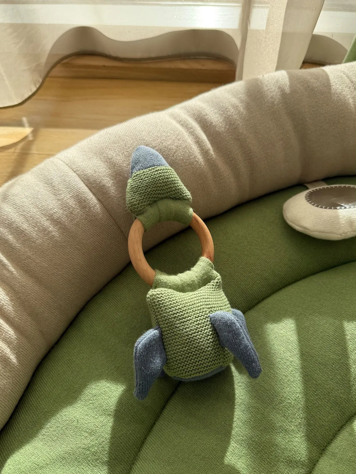 – Ranglen er nem at holde fast i med små hænder og laver bløde raslelyde, når dit barn ryster den.