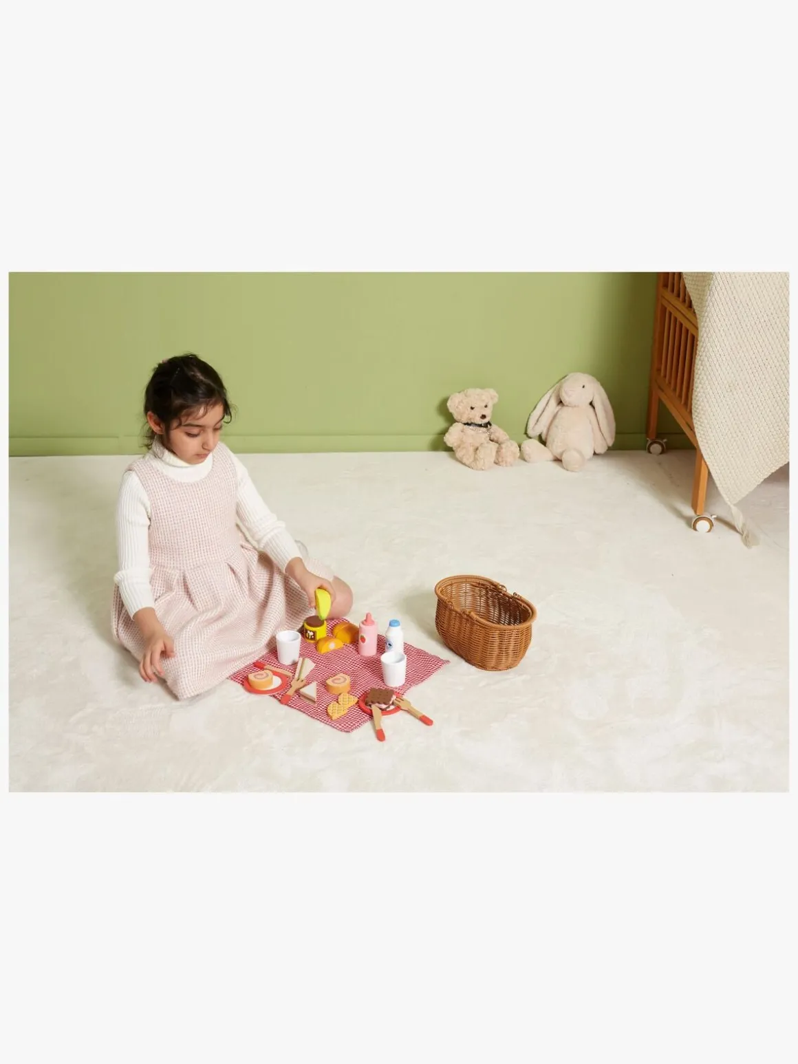 – Indeholder: 1 picnickurv, 1 picnictæppe, 2 tallerkener, 2 gafler, 2 legetøjsknive, 2 glas, 20 fødevarer.