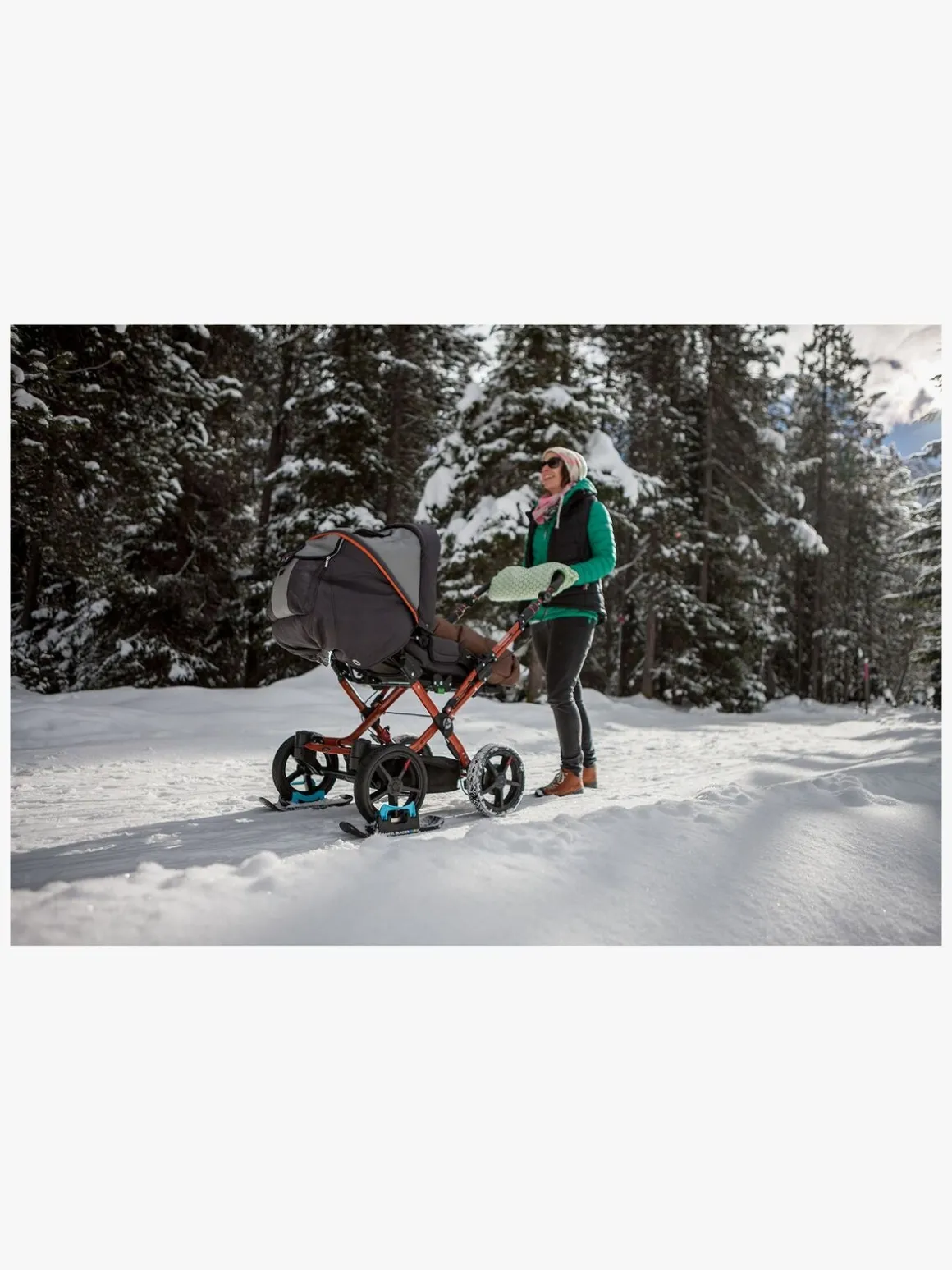 Takket være det patenterede hurtigbeslag er det let og hurtigt at skifte fra hjul til ski. Wheelblades brede overflade gør, at vægten fordeler sig optimalt på underlaget og forhindrer forhjulene i at synke ned i sneen.