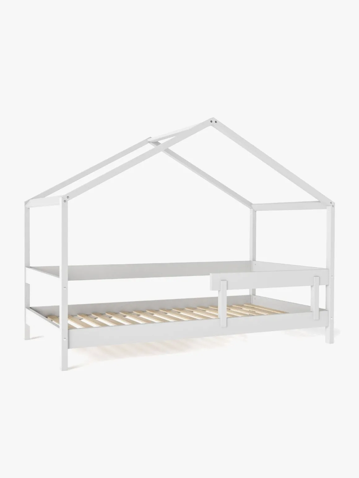 Der medfølger ramme, lamelbund og en sengehest, som kan fastgøres på sengen for øget sikkerhed.